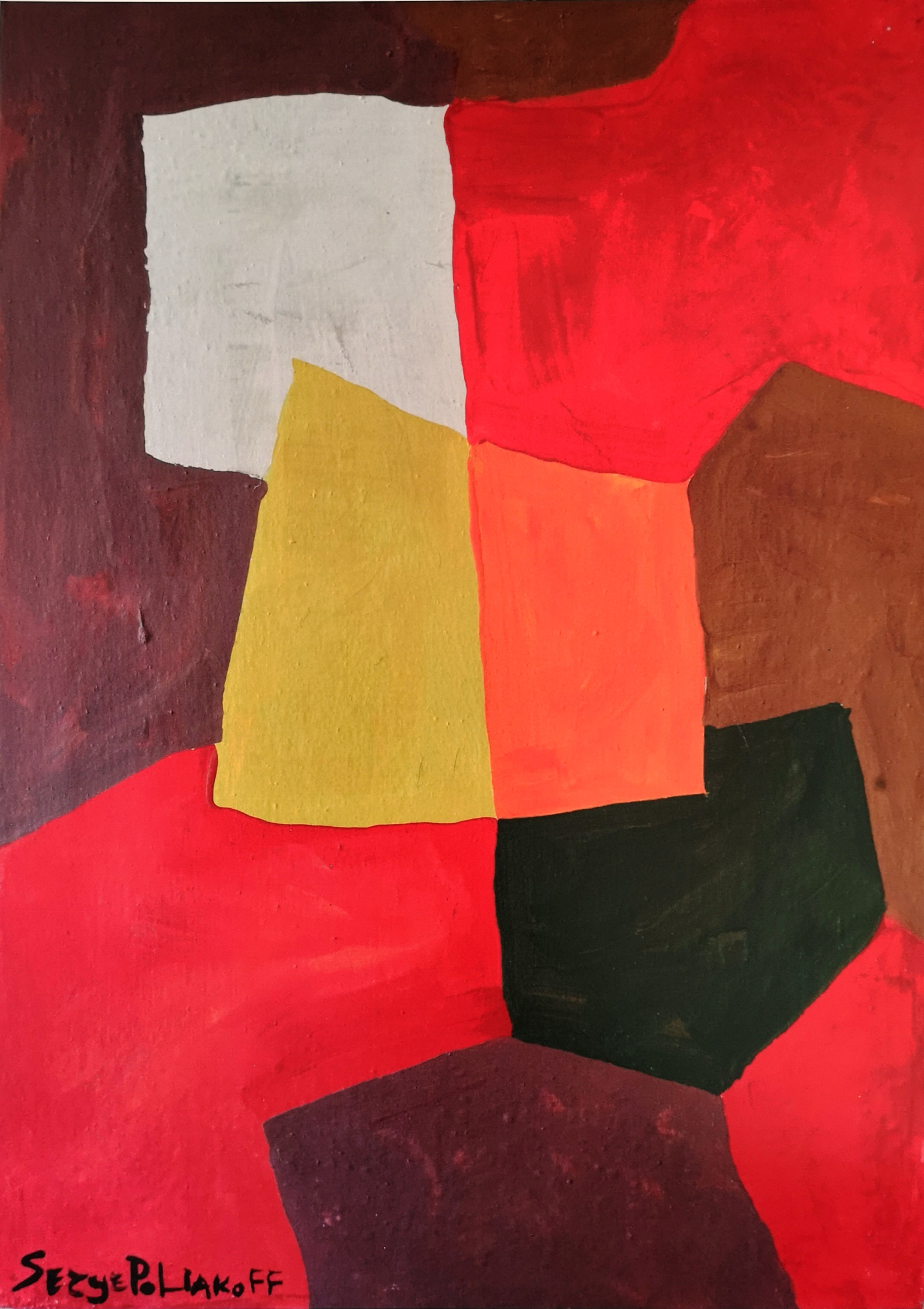 Serge Poliakoff : (1900-1969) est un peintre français d'origine russe (né à Moscou) appartenant à la nouvelle École de Paris. Il fait ses premiers pas dans l'art à l'école de dessin de Moscou. Quittant la Russie en 1918 (ou 1919) il arrive en 1920 à Constantinople, subsistant grâce à son talent de guitariste. Passant par Sofia, Belgrade, Vienne et Berlin Poliakoff s'établit en 1923 à Paris où il ne cessera de jouer dans les cabarets russes. En 1929, il s'inscrit à l'Académie de la Grande Chaumière. Ses peintures demeurent académiques jusqu'à la découverte qu'il fait à Londres — où il séjourne de 1935 à 1937 — de l'art abstrait et de la luminosité des couleurs des sarcophages égyptiens. Il se lie peu après avec Kandinsky, Sonia Delaunay et Robert Delaunay, Otto Freundlich. En 1935, rencontre coup de foudre avec la Britannique Marcelle Perreur Loyd qui deviendra sa femme et son plus fidèle soutien. Sa peinture se dégageant de toute représentation, Poliakoff est rapidement considéré comme l'un des peintres les plus puissants de sa génération. En 1962, une salle est réservée à ses peintures à la Biennale de Venise et Poliakoff est naturalisé français la même année. Ses œuvres figurent dans la plupart des musées européens et new-yorkais. Poliakoff a aussi travaillé la céramique à la Manufacture nationale de Sèvres. Il incita Arman à faire de la peinture. En 1965, Yves Saint Laurent signe une robe Poliakoff et une robe Mondrian. En 1970, première exposition au musée d'Art moderne de la Ville de Paris. En 1972, exposition avec Avigdor Arikha, Balthus, François Heaulmé, Giorgio Morandi, Mark Tobey, à la Galerie Hervé Odermatt, Paris. En 2006, Poliakoff fait partie des peintres rassemblés au Musée du Luxembourg (Sénat) pour l'exposition L'Envolée lyrique, Paris 1945-1956 (Composition en brun, 1947, Ny Carlsberg Glypothek, Copenhague; Composition rouge avec trait, 1952, Musée de Cologne; Composition IV, 1954). En 2013, le Musée d'art moderne de la ville de Paris consacre au peintre abstrait une importante rétrospective de près de 150 œuvres réalisées entre 1946 et 1969. Intitulée « Serge Poliakoff, le rêve des formes) ». Cette même année, la galerie Applicat-Prazan expose une vingtaine d'œuvre de Serge Poliakoff à la 40è édition de la FIAC.
