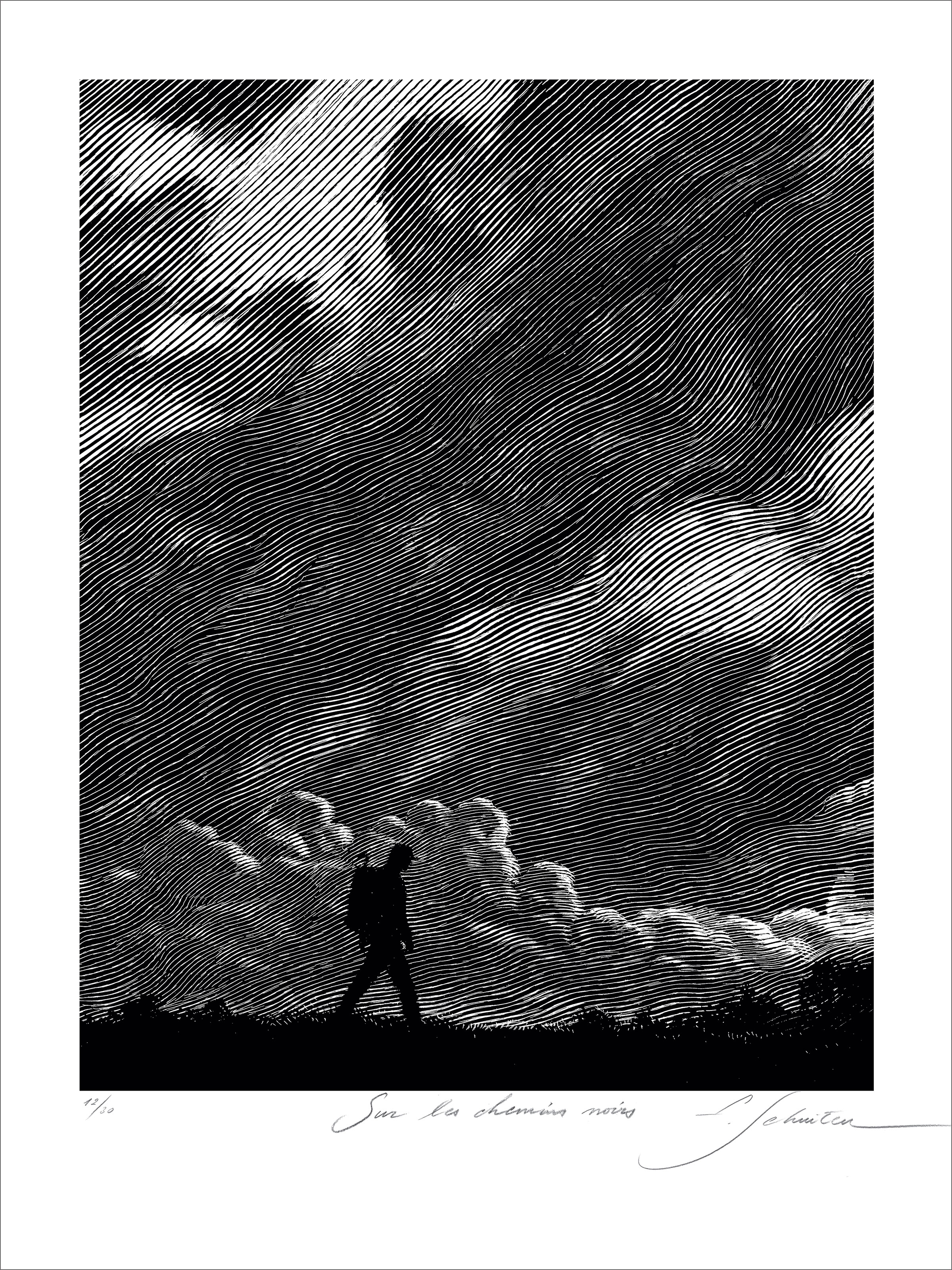 Tirage d'une gravure réalisée sur papier à gratter du livre 'Sur les chemins noirs' écrit par Sylvain Tesson et illustré par François Schuiten dans cette superbe réédition du roman.