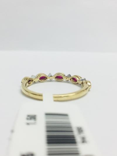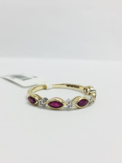 Anneau en or jaune 9 ct serti de 5 rubis naturels 4x2 mm et de 4 diamants 0.02 ct