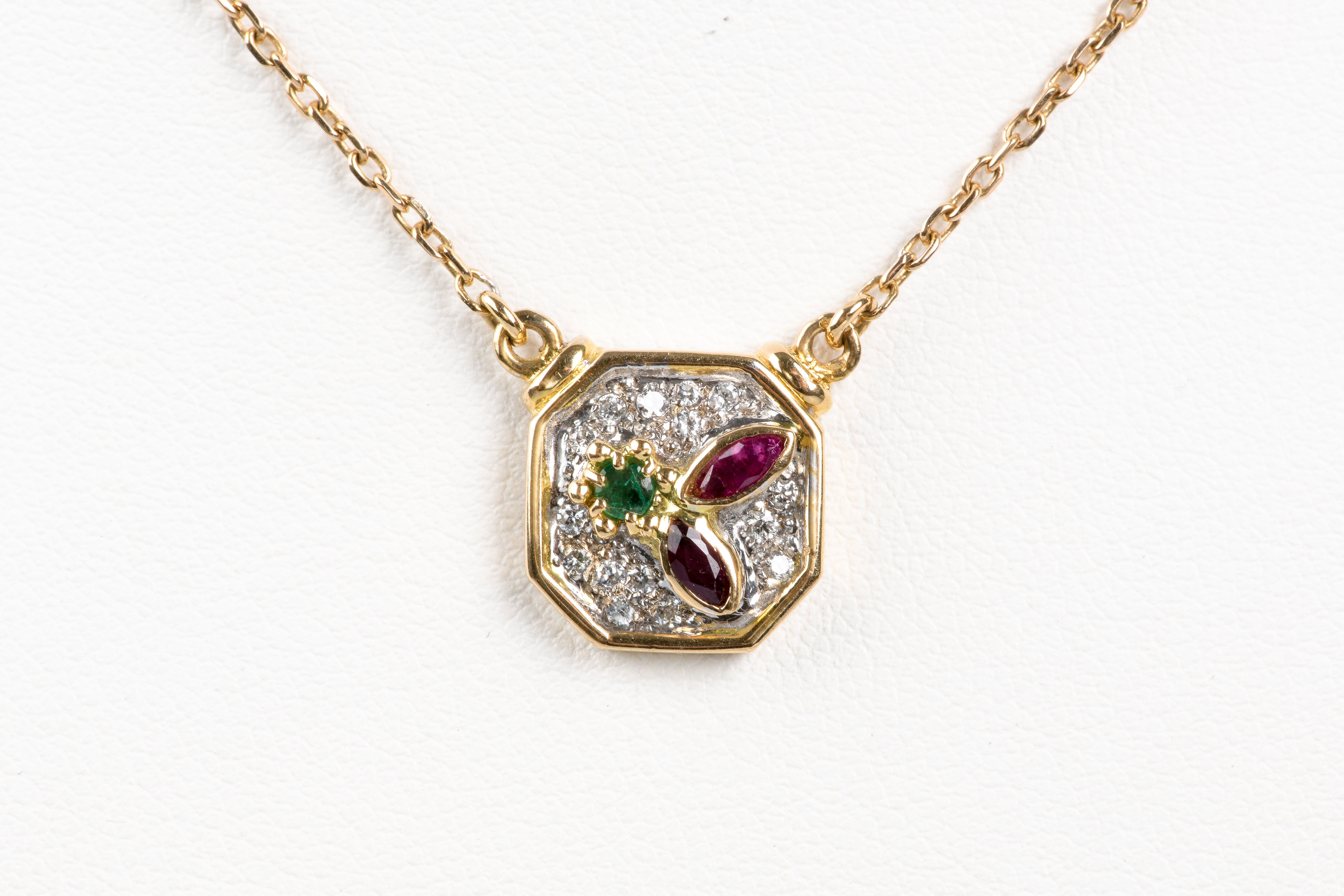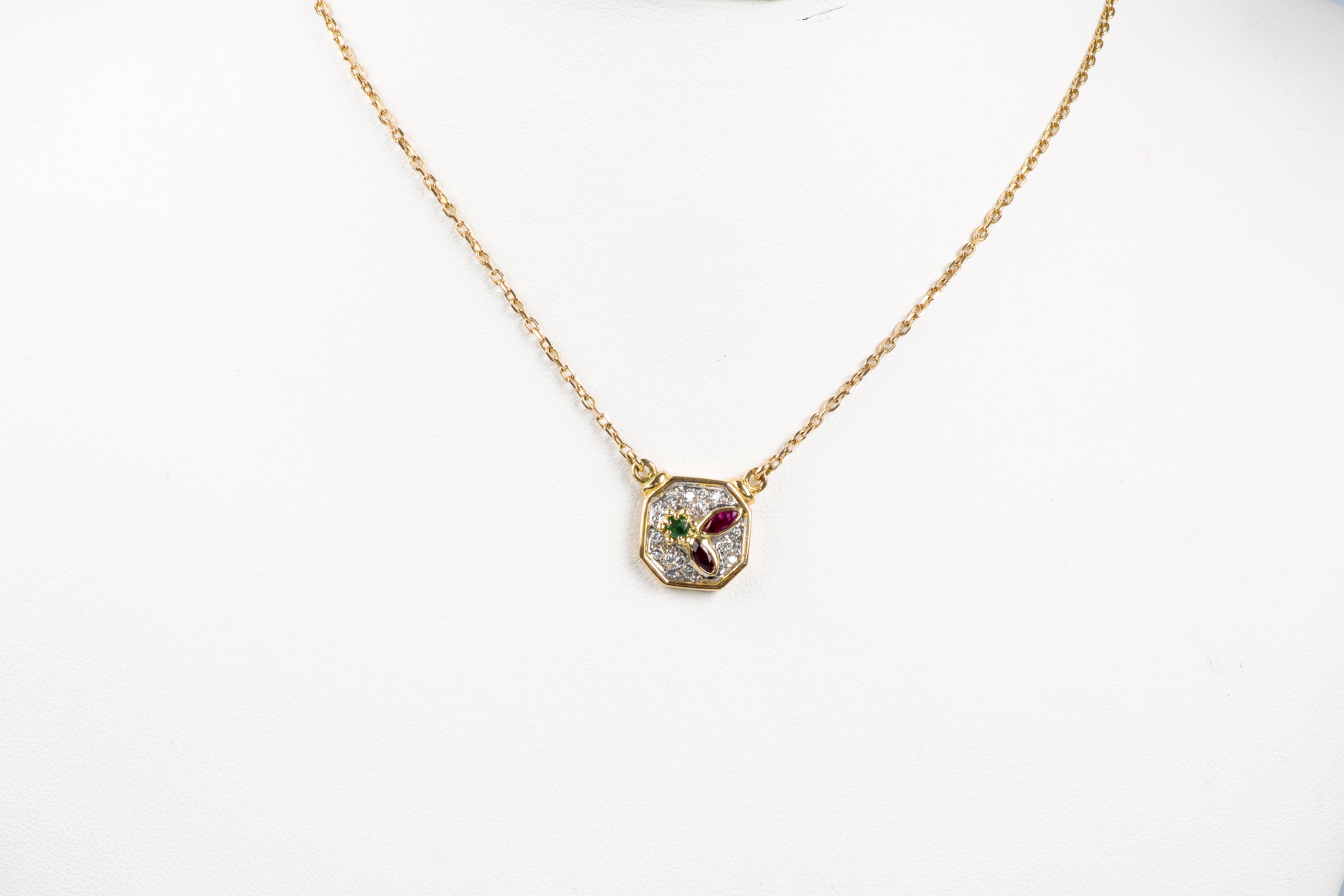 Collier or jaune de 18 carats orné de 1 Emeraude de 0.03 carat, 2 Rubis de 0.04 carat et 15 Diamants de 0.15 carat .
