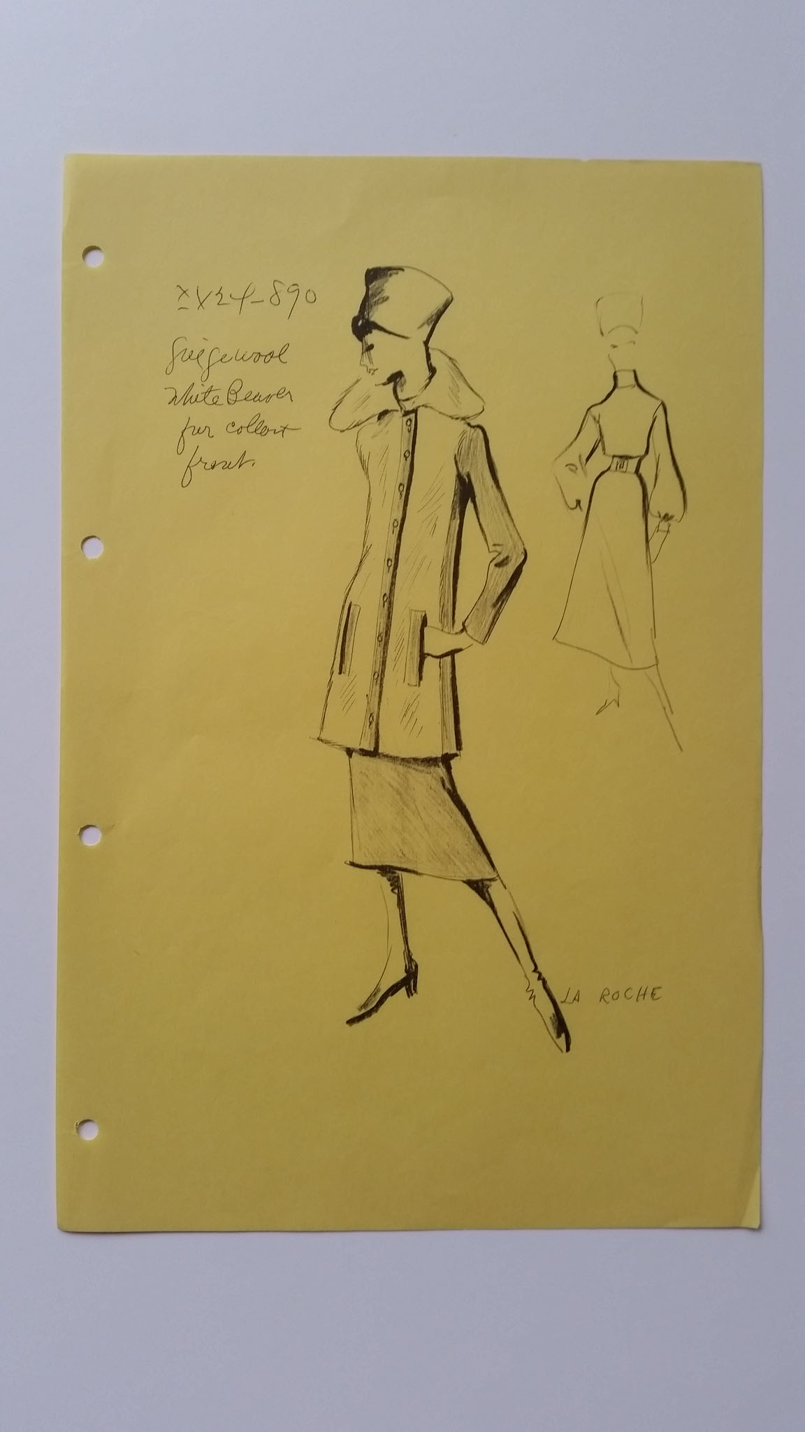 Très beau croquis pour veste en fourrure de castor et robe Guy Larocheréalisé par le bureau de style de New York du couturier signé Guy Laroche.