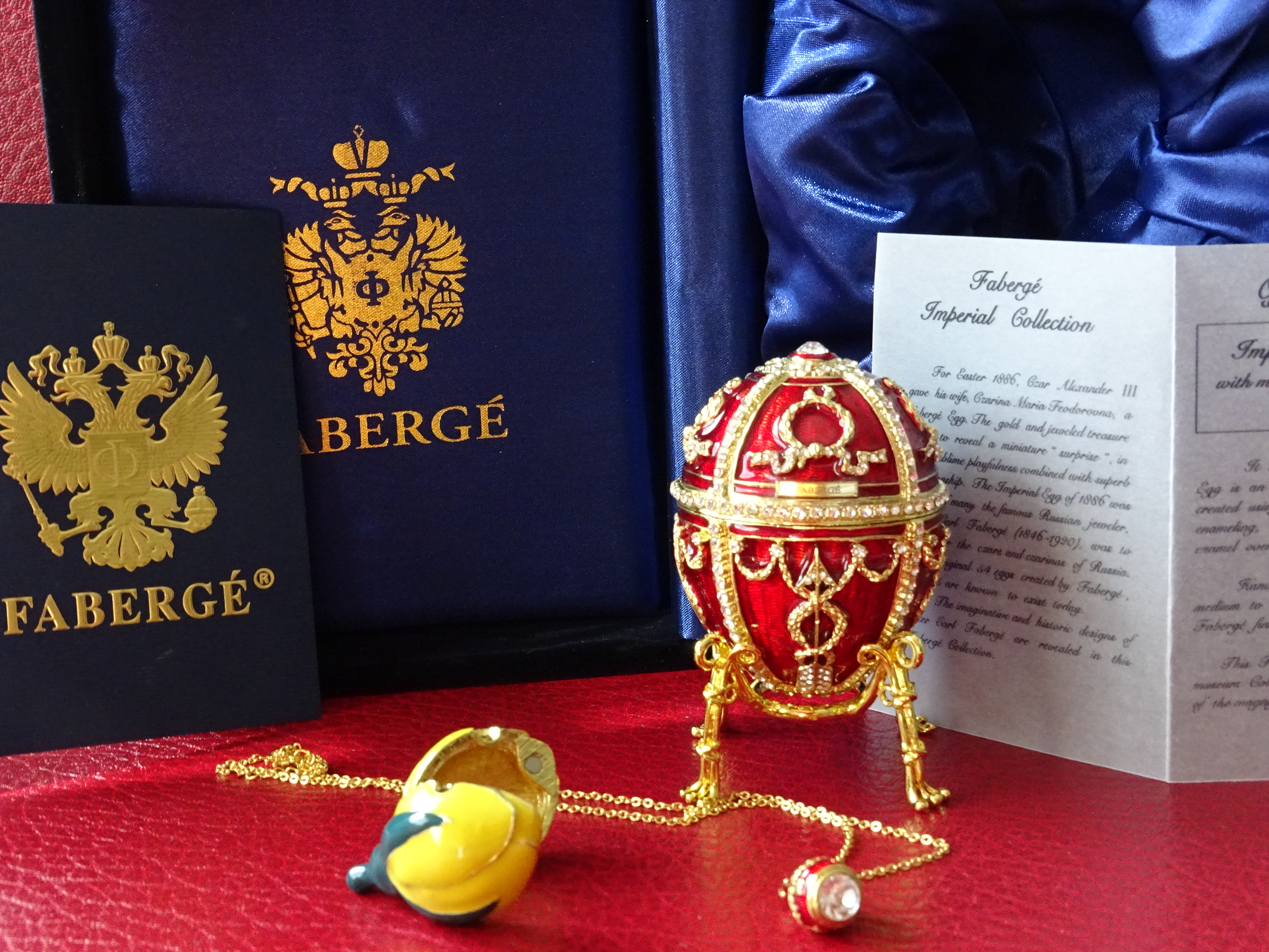 Collection impériale de la Maison Fabergé. Cet œuf a été créé exclusivement par la Maison Fabergé. Taille de l'oeuf incluant la base 10cm Il s'agit d'un objet très coté sur le marché de l'art. Émail avec strass swarovski finition plaqué or 24 carats d'un très bel éclat. Voir les nombreuses photos pour avoir une bonne idée de tous les détails et des superbes illustrations de cet œuf. Pendentif à l'intérieur La famille Fabergé est originaire de France mais a été contrainte de quitter le pays en raison des persécutions religieuses. Au XVIIIe siècle, la famille s'installe en Russie. Peter Carl Fabergé est né le 30 mai 1846, fils d'un orfèvre. Après un apprentissage auprès de plusieurs maîtres orfèvres en Allemagne, en France et en Angleterre, Peter Carl Fabergé revient à Saint-Pétersbourg en artisan très accompli. En 1885, Peter Carl Fabergé présenta le premier œuf impérial au tsar Alexandre III et devint rapidement le joaillier le plus célèbre du monde.
