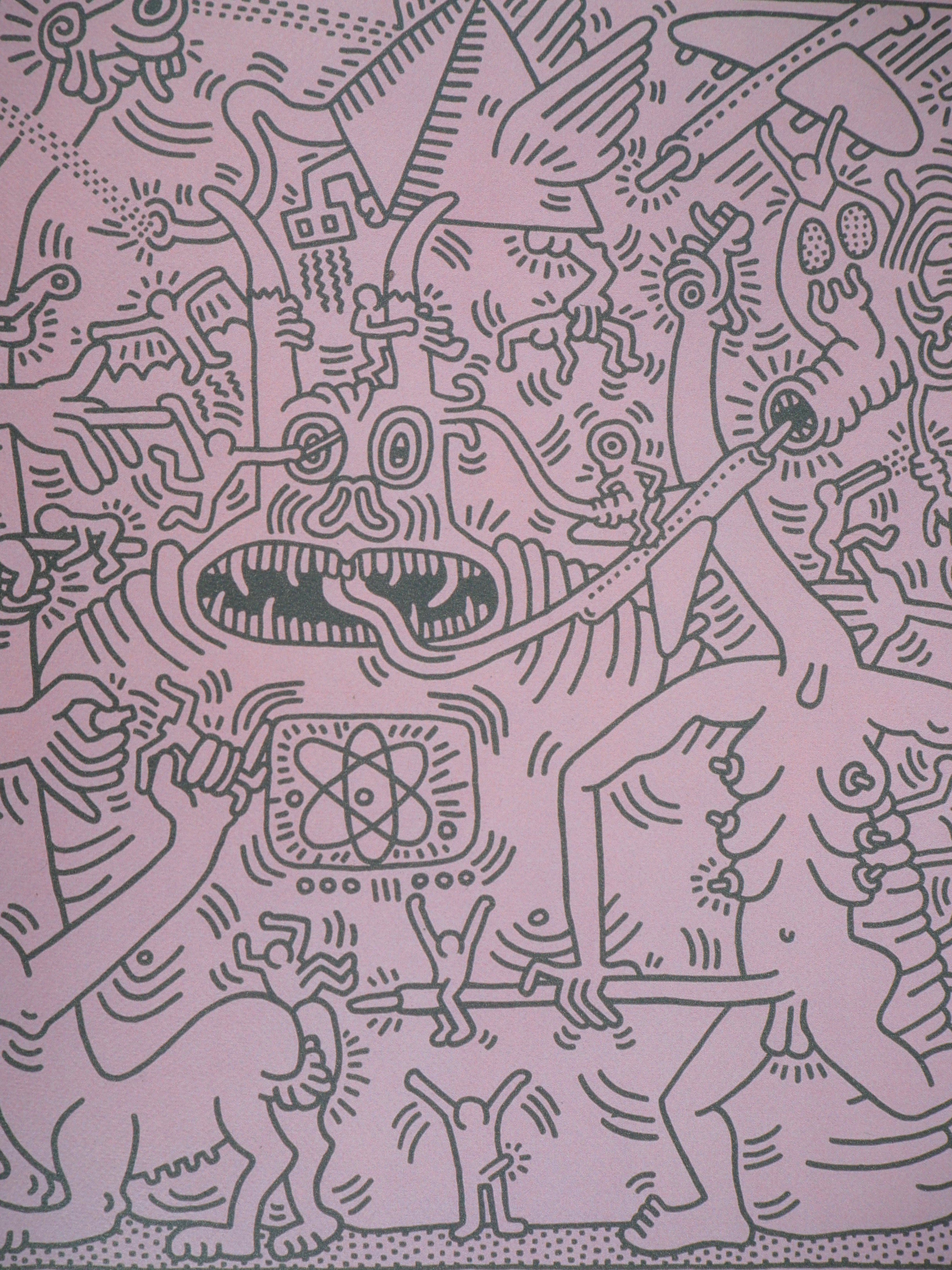 Keith Haring : (1958-1990), né à Kutztown en Pennsylvanie en 1958, est un artiste américain. Il étudie à la School of Visual Arts de New York entre 1978 et 79. Il y découvre la foisonnante culture alternative des années 1980 et y recontre des artistes de la vie underground new-yorkaise tels que Jean-Michel Basquiat. Son art est né de l'expression des graffeurs: il s'apparente aux "tags". À partir de 1981, Haring recouvre de graffitis les panneaux publicitaires du métro new-yorkais. La même année, Tony Shafrazi réalise sa première exposition. Keith Haring développe un graphisme inspiré par la bande dessinée et les images électroniques. Il mêle des cultures historiques et médiatiques pour atteindre une iconographie qui repose sur des archétypes. Comme les artistes Pop Art, son art est l'écho d'un monde marqué par ses propres contradictions, partagé entre le rêve américain et la réalité sociale du racisme, de l'exclusion et de la violence. Son œuvre ne cessera d'évoluer et de s'imposer sur la scène internationale jusqu'à sa mort. L'artiste crée de véritables environnements : sculptures rappelant des totems africains, peintures murales dans des espaces publics. Il diffusera ses images sous la forme de badges, t-shirts, affiches, par le biais de son "Pop shop". Surtout, Keith Haring met son art au service de causes qui lui tiennent à cœur, telles que les campagnes antinucléaires ou encore contre l'apartheid en Afrique du Sud. Entre 1982 et 1989, il a créé pas moins de 50 œuvres publiques aux quatre coins de la planète, principalement pour des associations, hôpitaux, orphelinats etc. Véritable artiste engagé, Keith Haring participera activement à la lutte contre le SIDA, lui-même infecté en 1988, en dédiant sa notoriété et son art au service de cette lutte. Il décédera des complications liées à la maladie en 1990, laissant derrière lui une œuvre abondante et singulière, encore aujourd'hui ancrée dans les esprits de tous, qui lui survit grâce à de nombreuses rétrospectives, et la présence de ses pictogrammes dans la culture populaire et les produits dérivés... Ses œuvres sont aujourd'hui conservées dans tous les plus grands musées du monde.