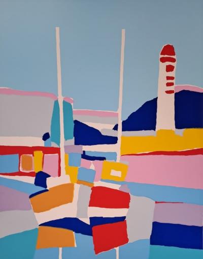 Victor Hasch - Bateaux au port - Lithographie originale en couleur, signée