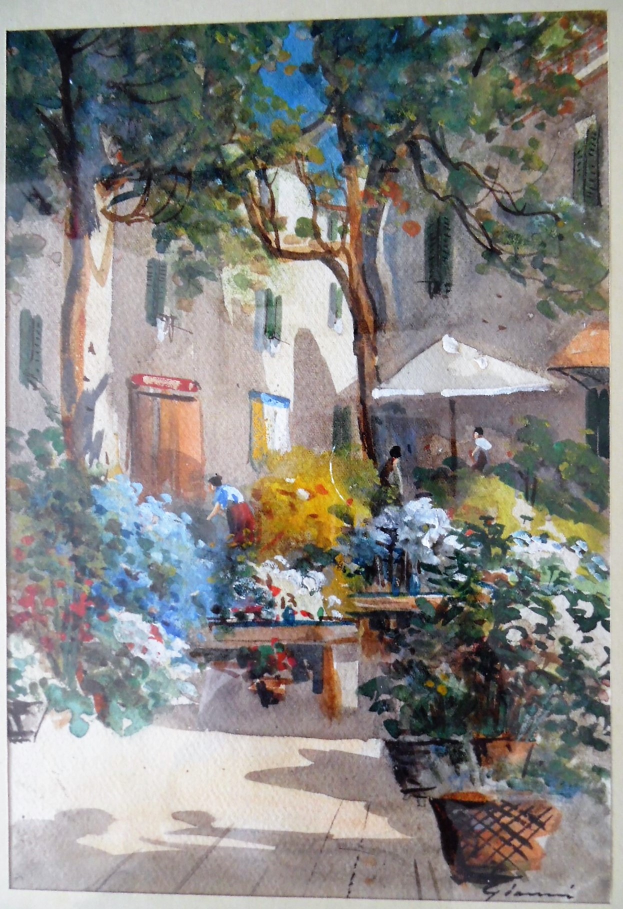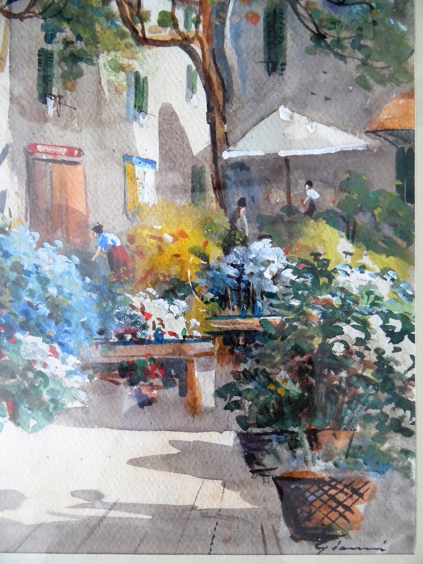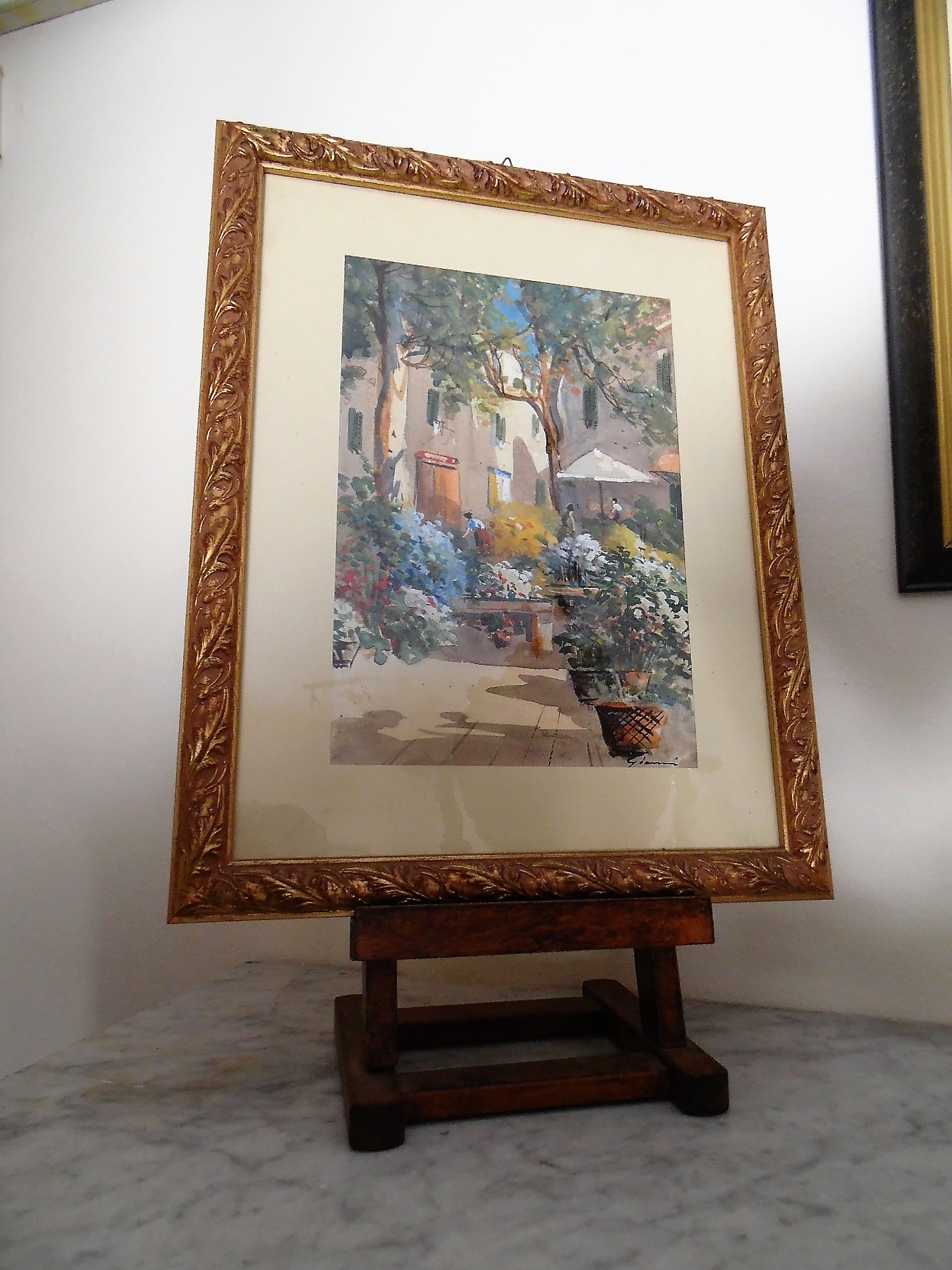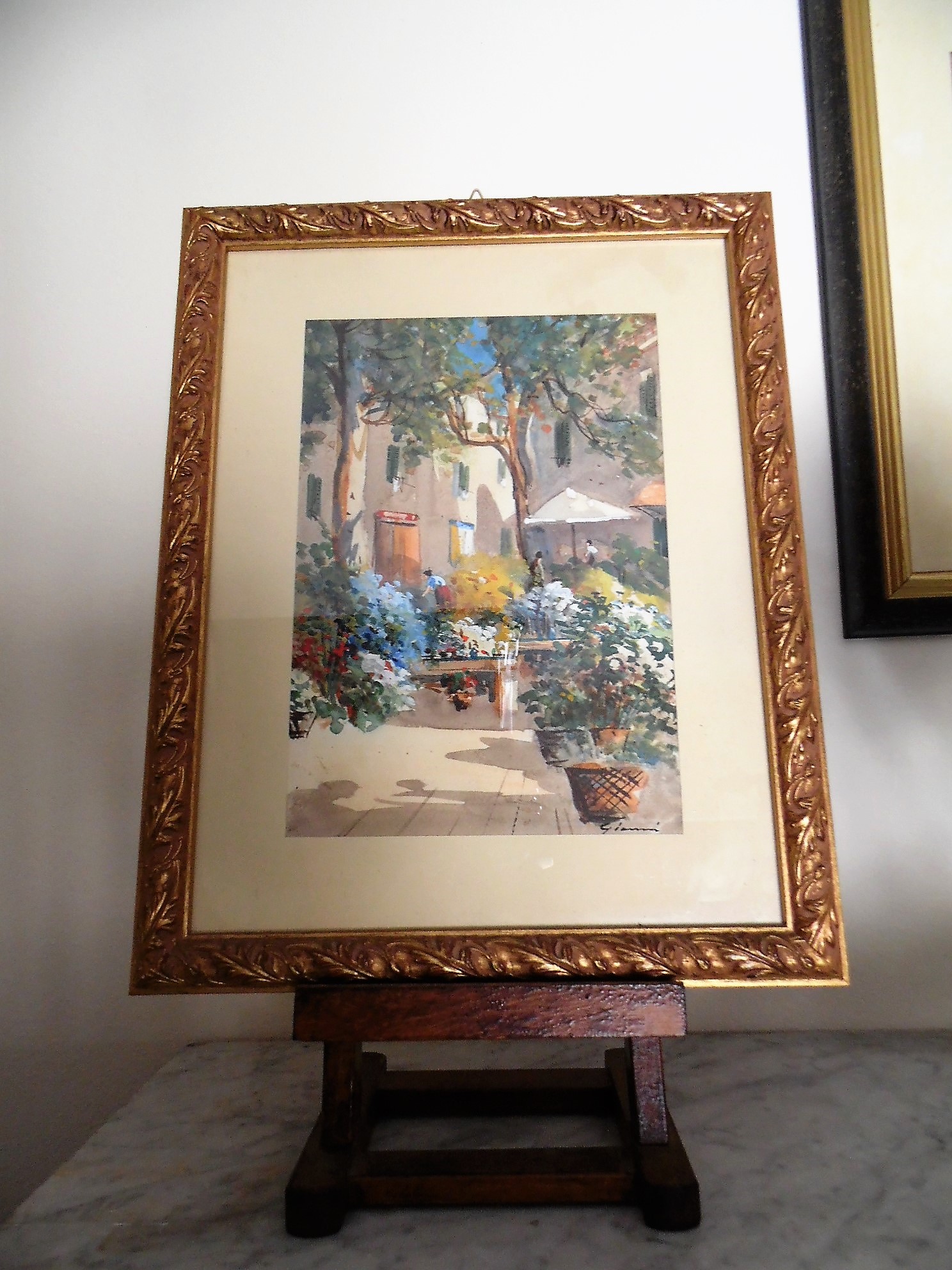 Italian Street Scene by Gianni, watercolour - Gouache on Paper. La famiglia Gianni attiva in Napoli dal XIX/XX secolo, annovera tra i suoi rappresentanti piu' noti Girolamo Gianni, Gian Gianni, Y Gianni, Maria Gianni. Le opere di impostazione realista, raffigurano scene di genere con vedute di Napoli, Capri e penisola sorrentina. L'acquerello e' in condizioni perfette. Cornice nuova in stile.