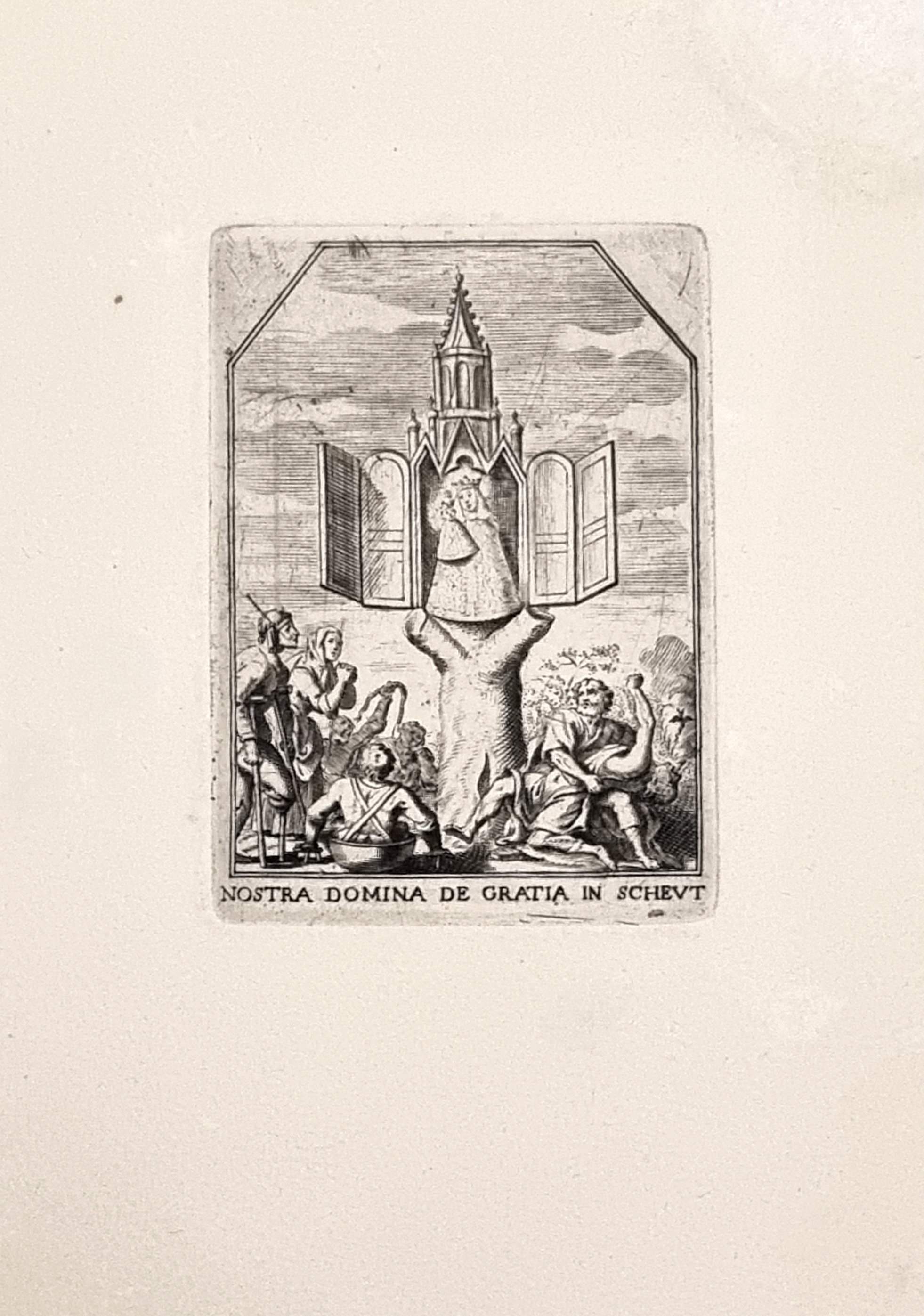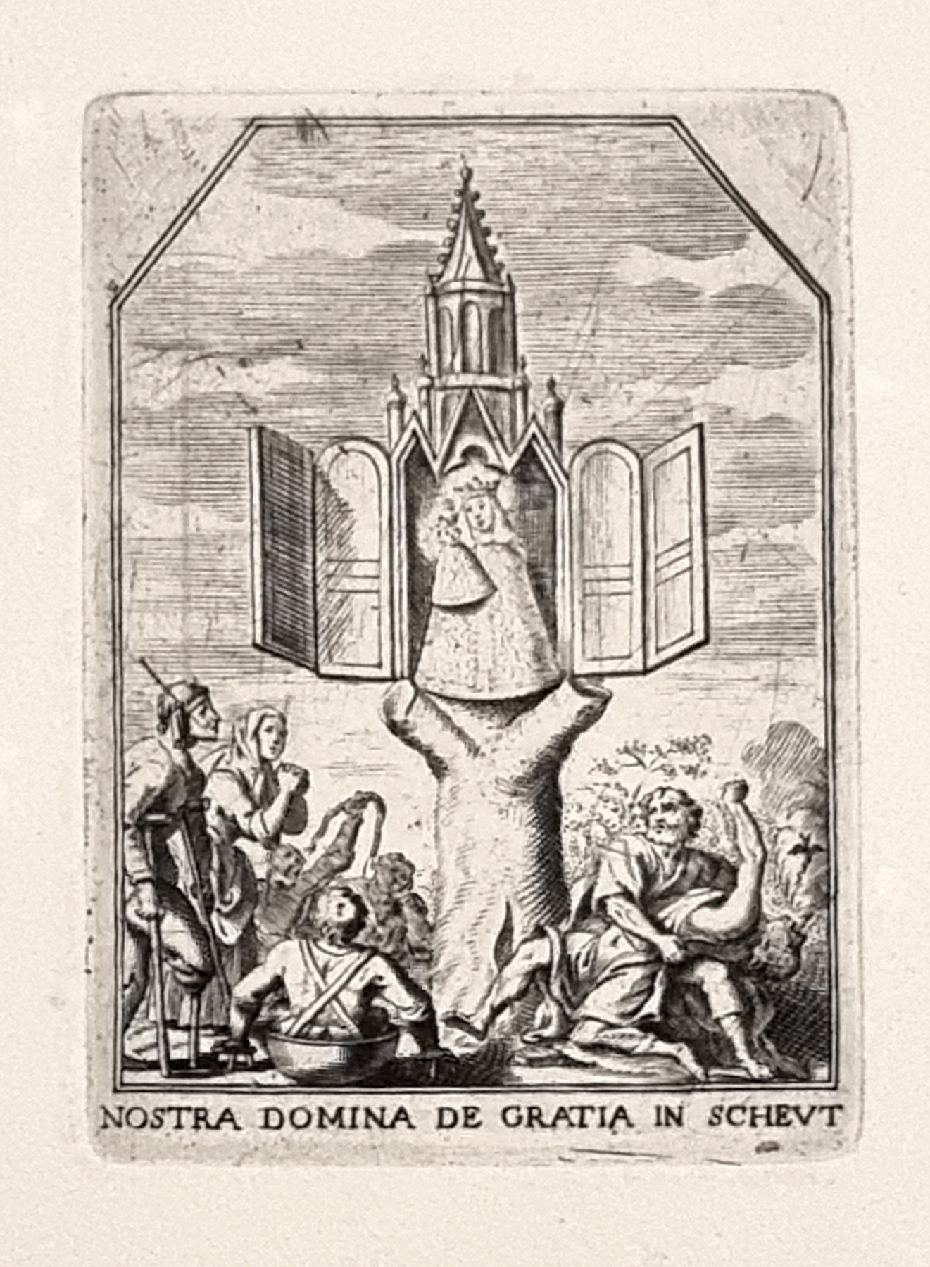 L'incisione raffigura la Madonna delle Grazie di Scheut. Scheut è un borgo storico situato ad Anderlecht, oggi comune di Bruxelles (Belgio). Fu un rinomato luogo di pellegrinaggio mariano a partire dal XV secolo.