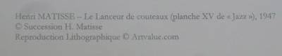 Henri MATISSE (dopo) Lanciatori di coltelli Litografia Tavola 15 dall’album JAZZ, Ristampa di Art Value nel 2006 Stampato da Arts Lithographes di Parigi Riproduzione litografica. Giustificato sul retro dall’editore. Dimensioni: 58 x 79 cm