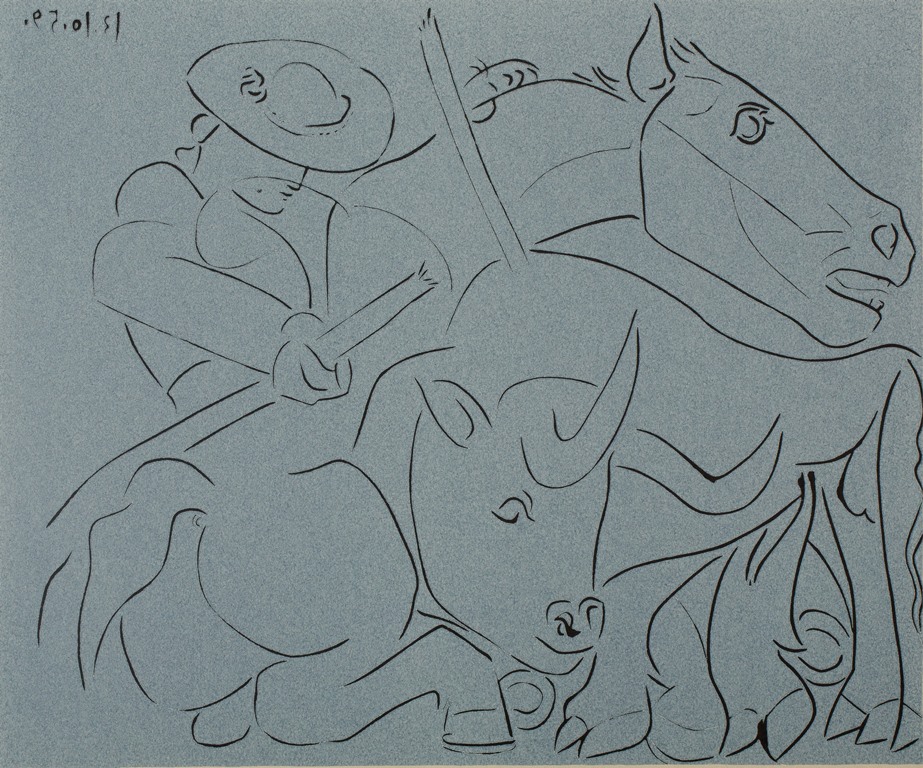 Pablo PICASSO (1881-1973) (dopo) Picador e Toro Linoleografia su pergamena 32 x 37 cm Stampato dal Cercle d’Art (1962) Ottime condizioni, margini cuciti, rari difetti ai margini che non intaccano l’incisione su linoleum