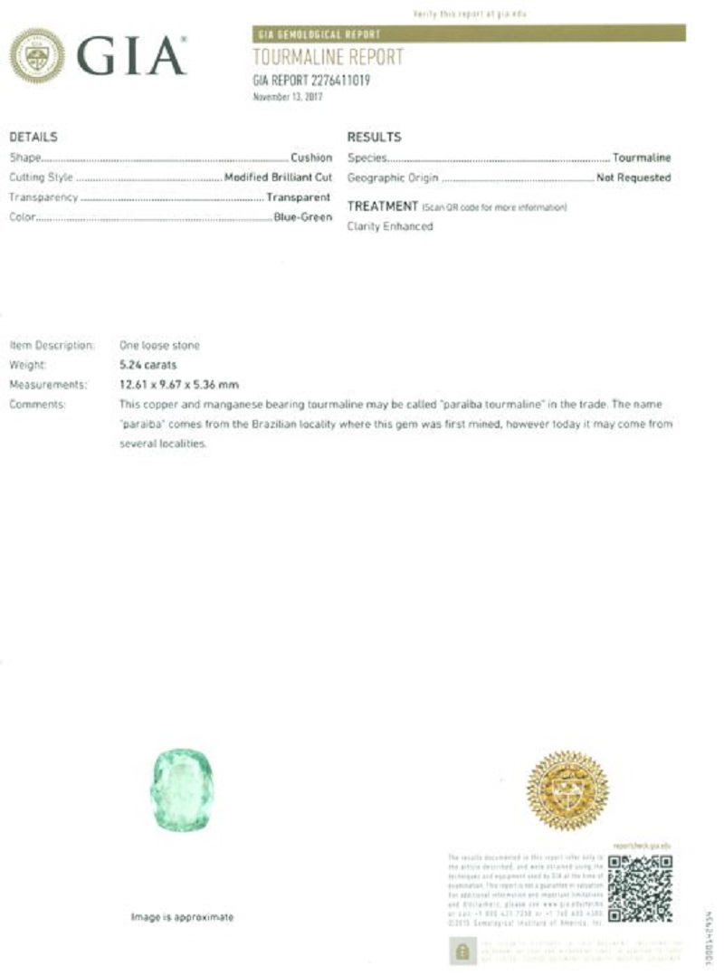 5,24 ct. Tormalina Paraiba Verde Neon Blu - BRASILE : GIA Certified ct. wt. - 5,24 ct. Colore: blu-verde Taglio - Cushion Modified Taglio brillante Chiarezza - SI Dimensioni: 12,61 x 9,67 x 5,36 mm Origine - BRASILE Trattamento - Maggiore chiarezza. Le tormaline Paraiba sono normalmente riscaldate. Tormalina contenente rame e manganese. GIA Report n. - 2276411019