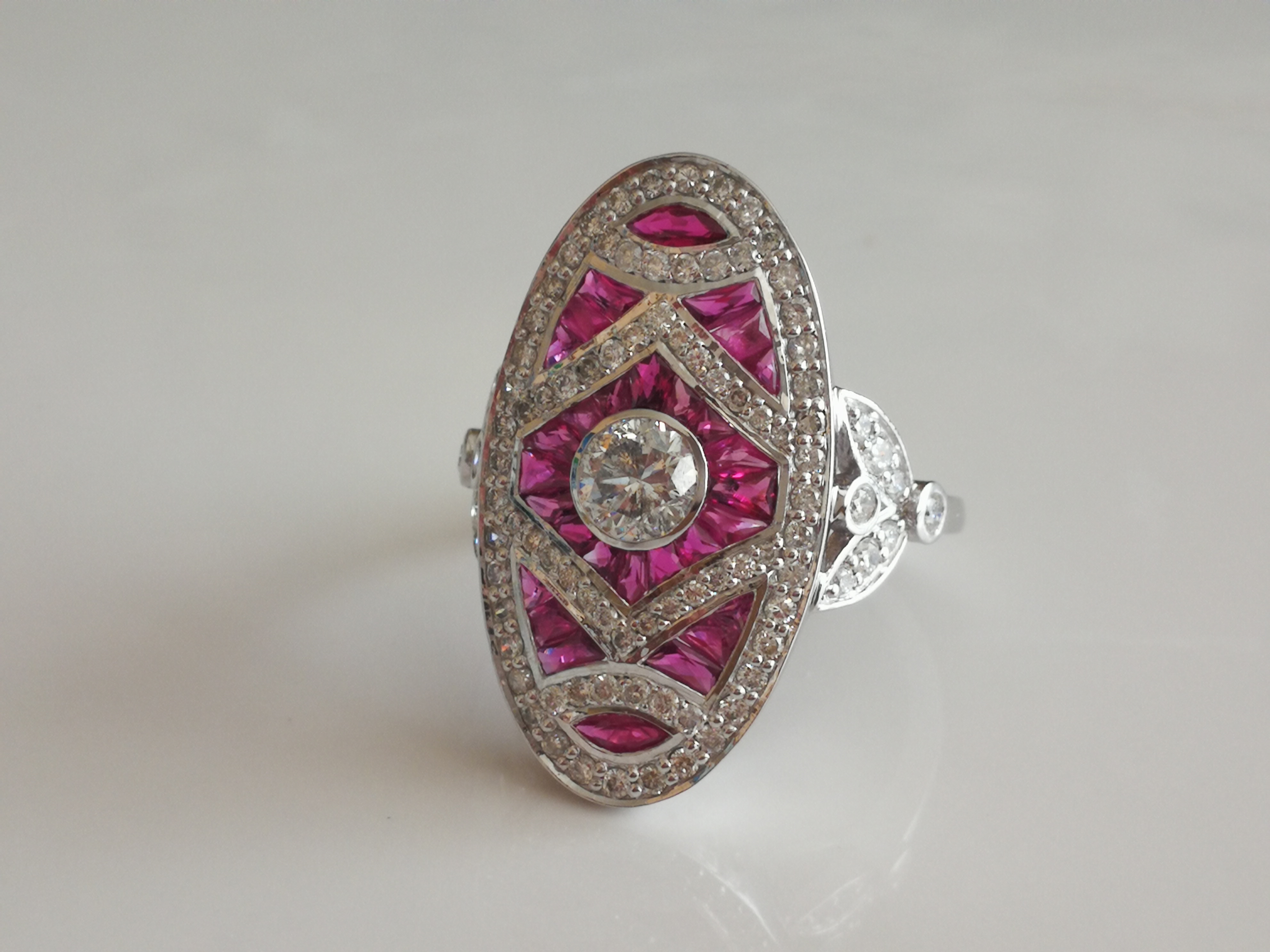ANELLO in oro 750 (18 KT) in stile Art Déco ornato al centro da un DIAMANTE di 0,44 carati in una montatura di RUBINI e DIAMANTI calibrati (+ 0,73 carati)