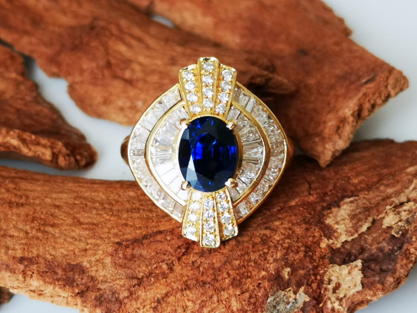 Bague en or jaune 18 carats de forme marquise sertie en son centre d'un beau saphir ovale de 2.5 carats dans un important entourage de diamants calibrés et ronds