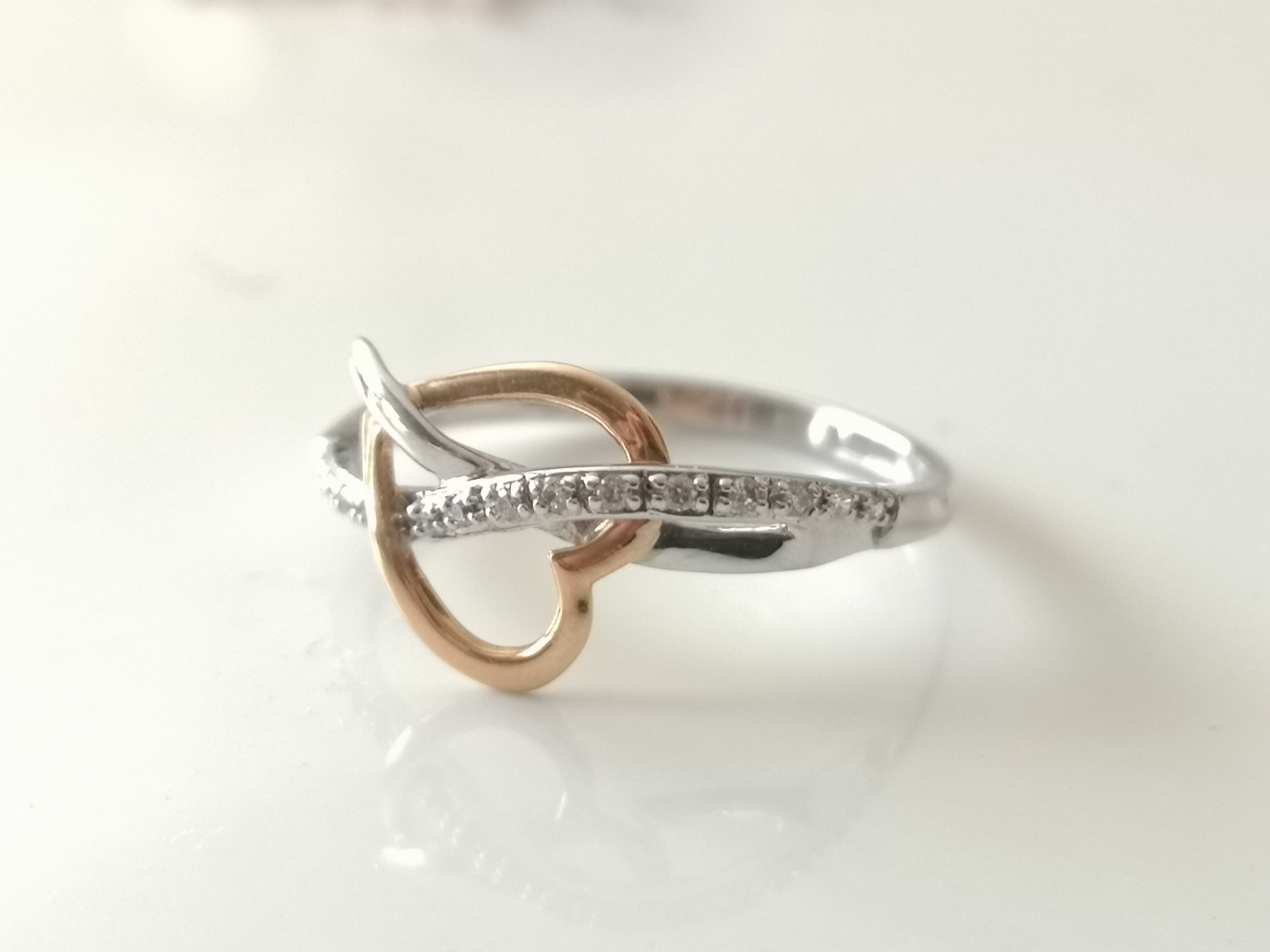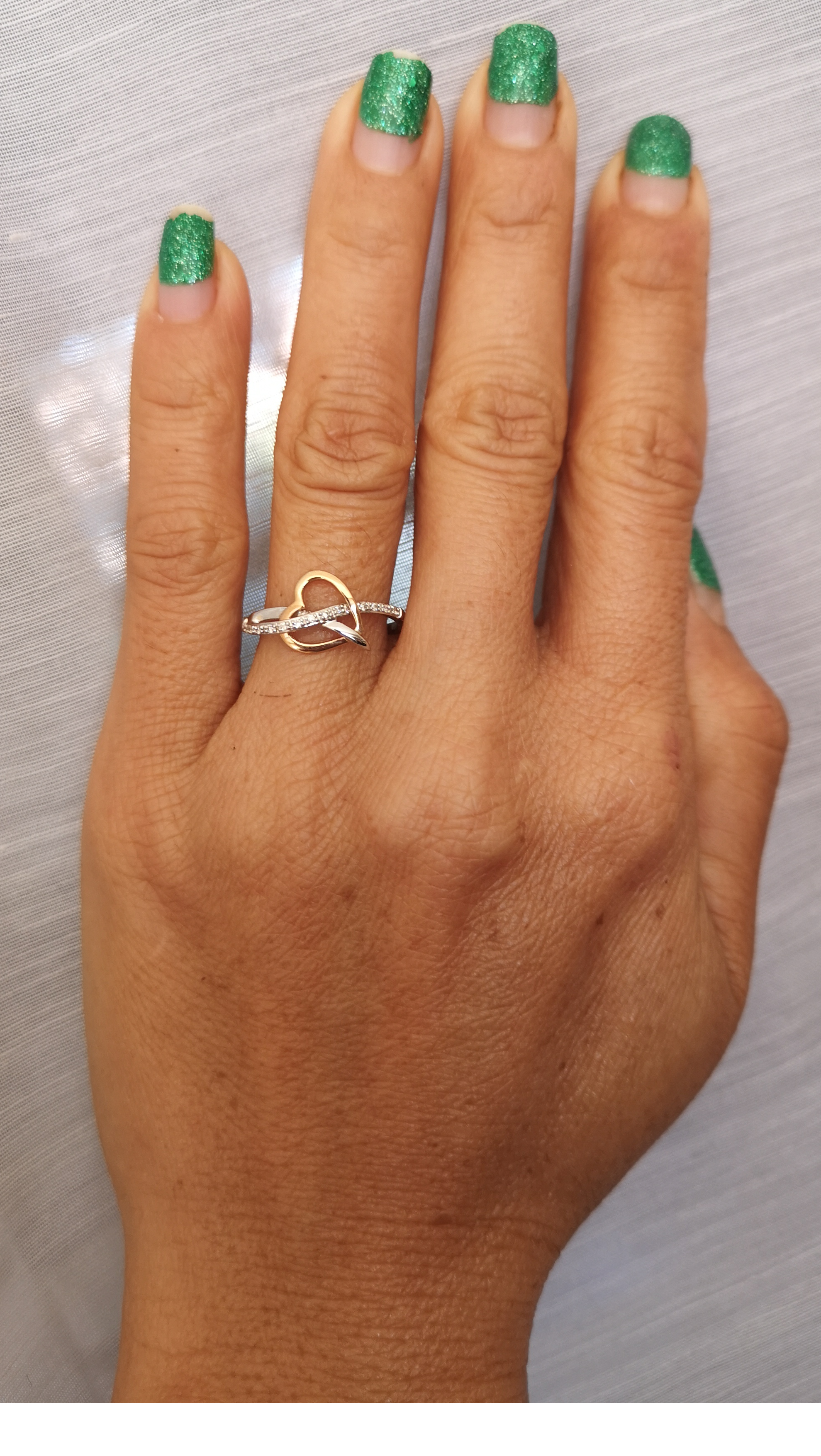 Anello in oro giallo e oro bianco 18 carati (750/1000) formato da cuori intrecciati impreziositi da diamanti