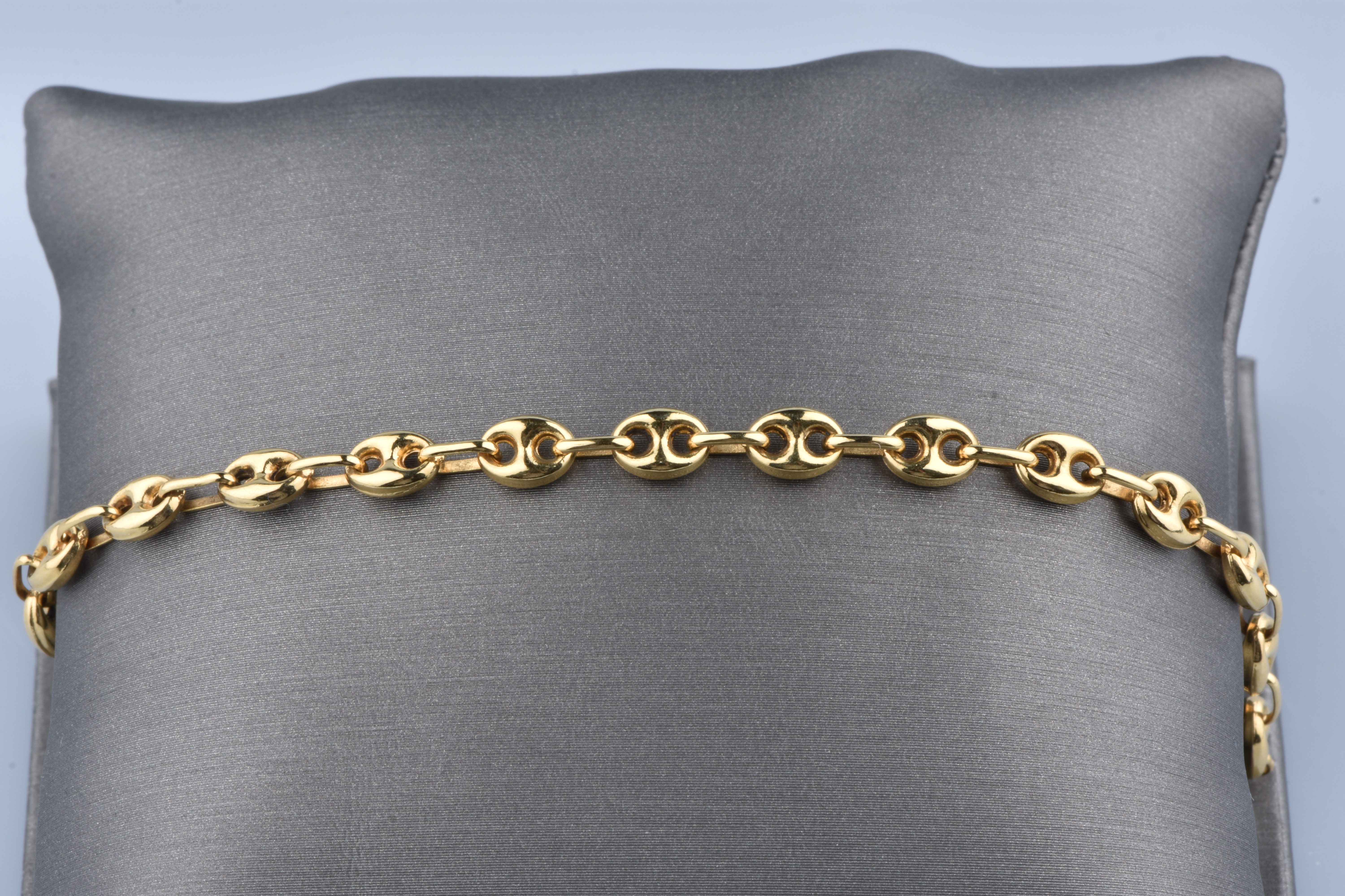 Bracelet en or jaune 18 carats. Maille grain de café, fermoir mousqueton.