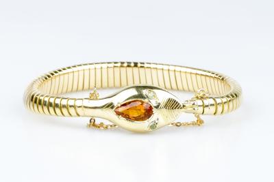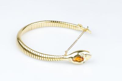 Bracciale serpente in oro giallo 18 carati ornato da un citrino a forma di pera da 0,28 carati e 2 peridoti tondi da 0,02 carati ciascuno, ovvero 0,04 carati in totale, maglia tubogas e chiusura a clip con catena di sicurezza.