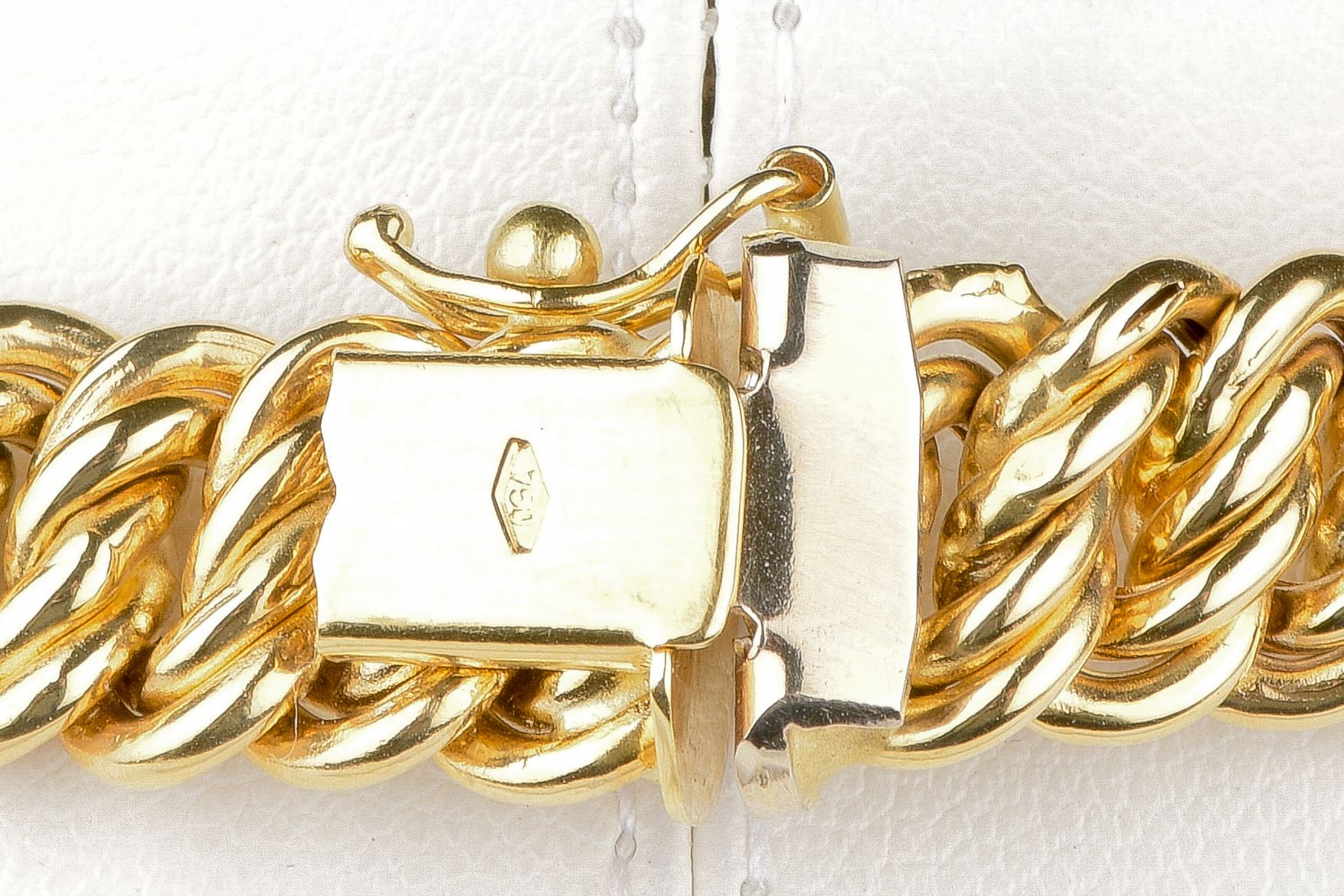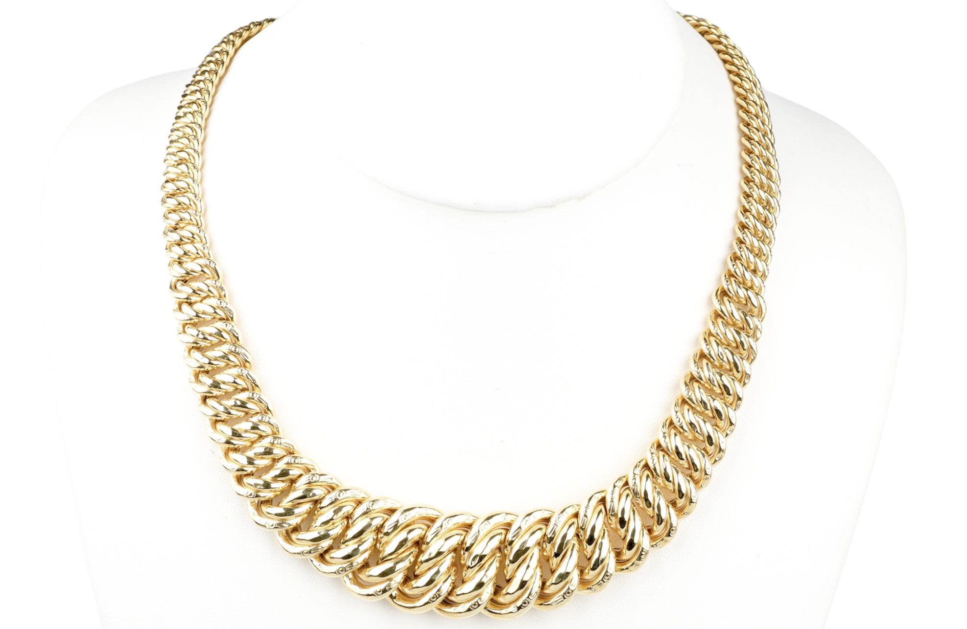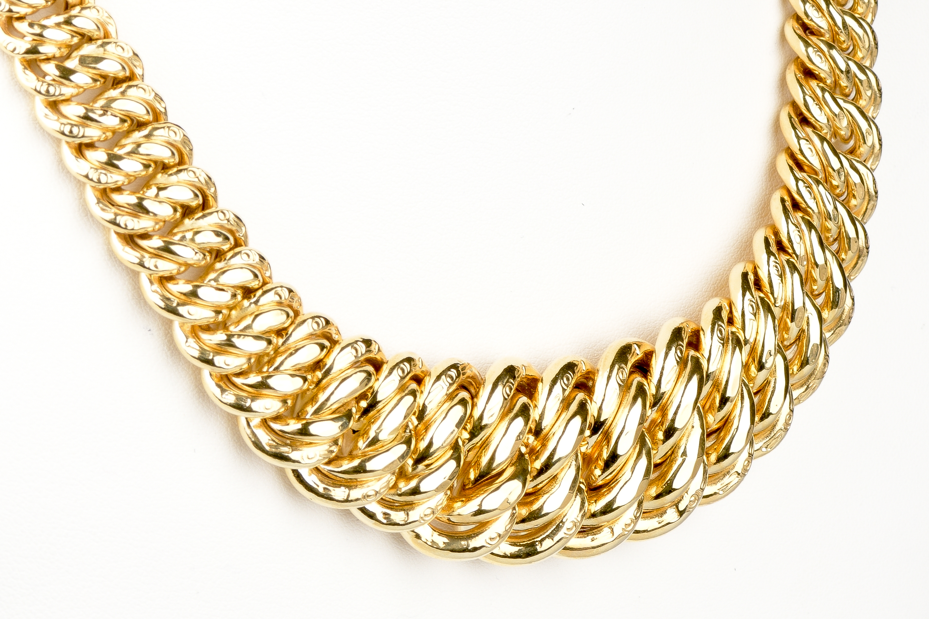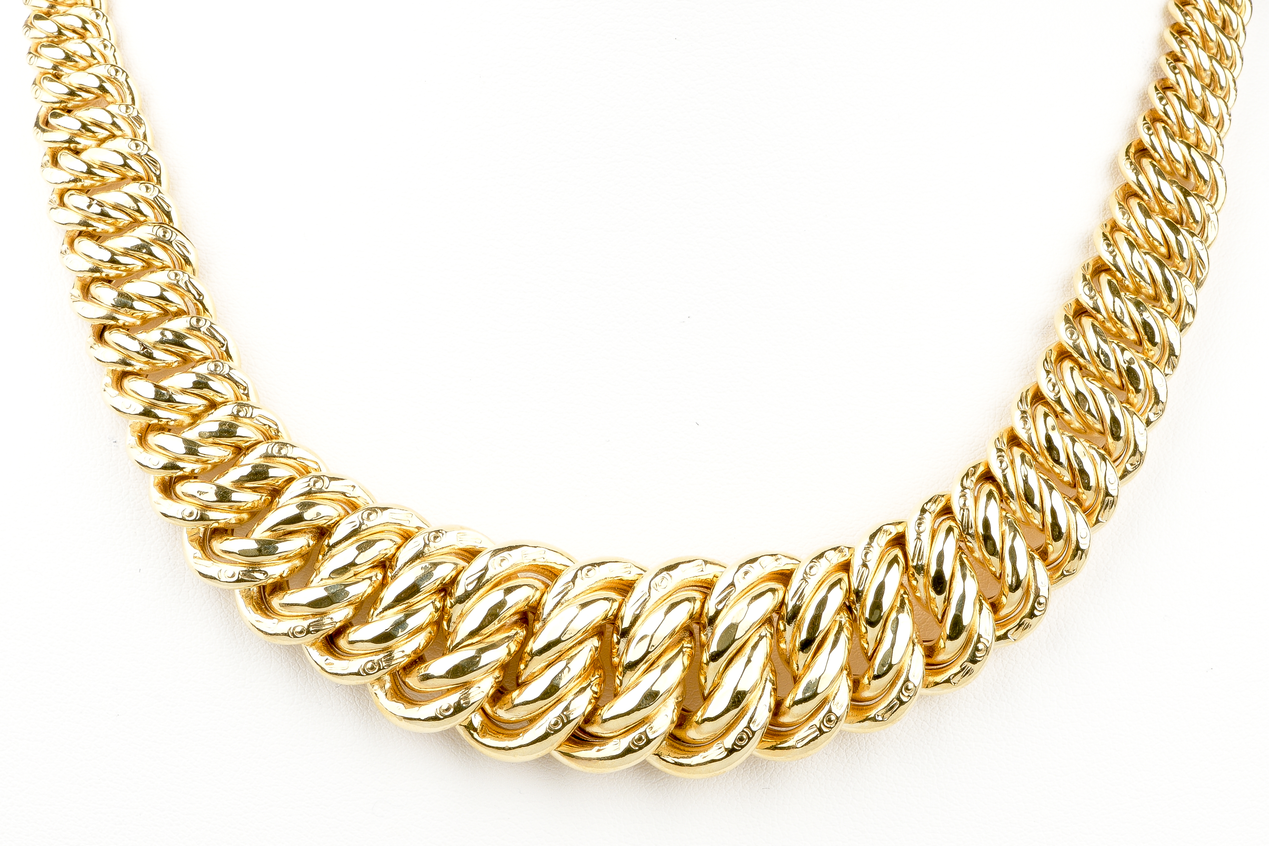 Collana in oro giallo 18 carati in autunno decorata da maglia americana e chiusura con clip. La maglia si allarga per chiudersi alla chiusura.