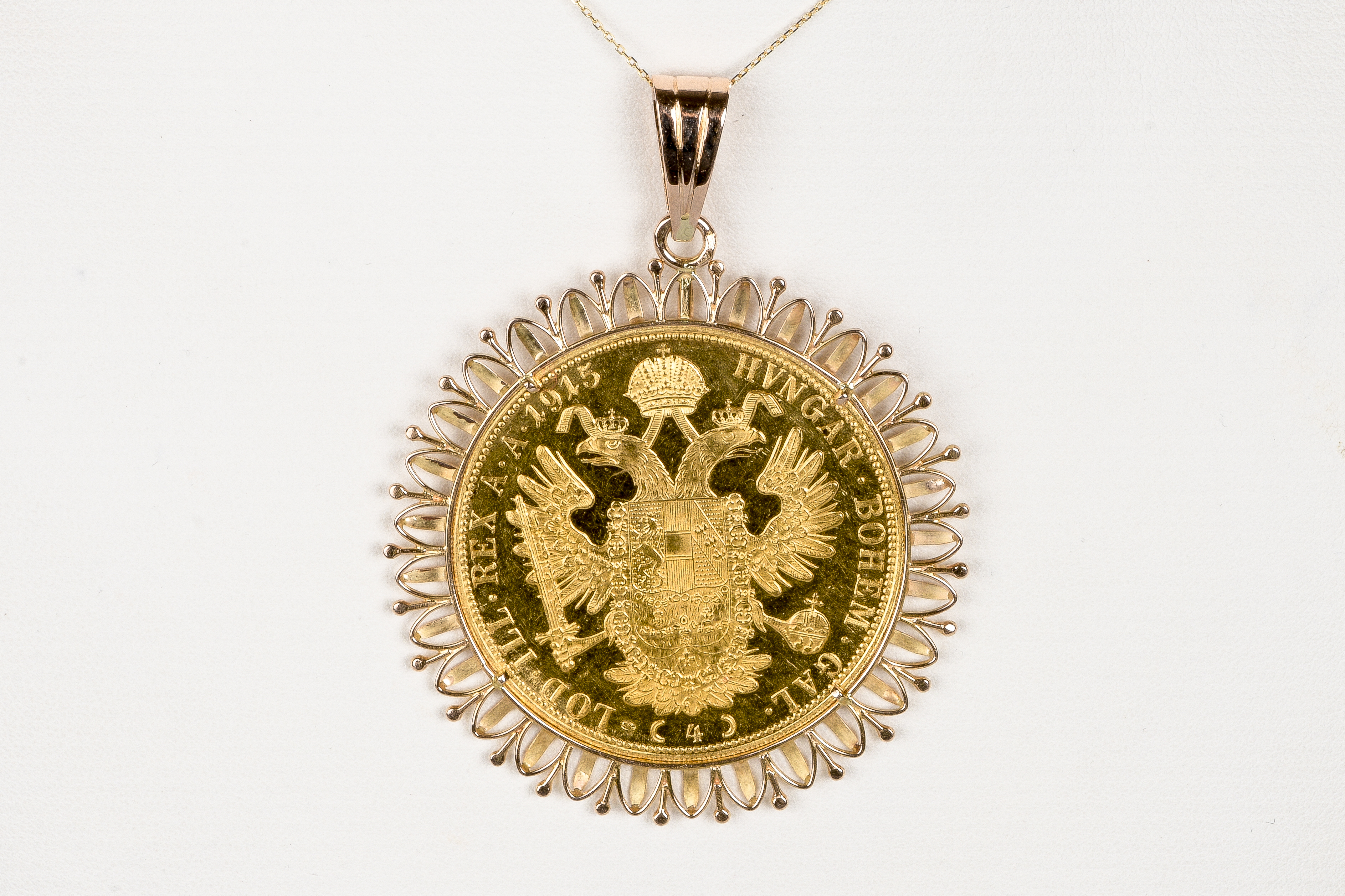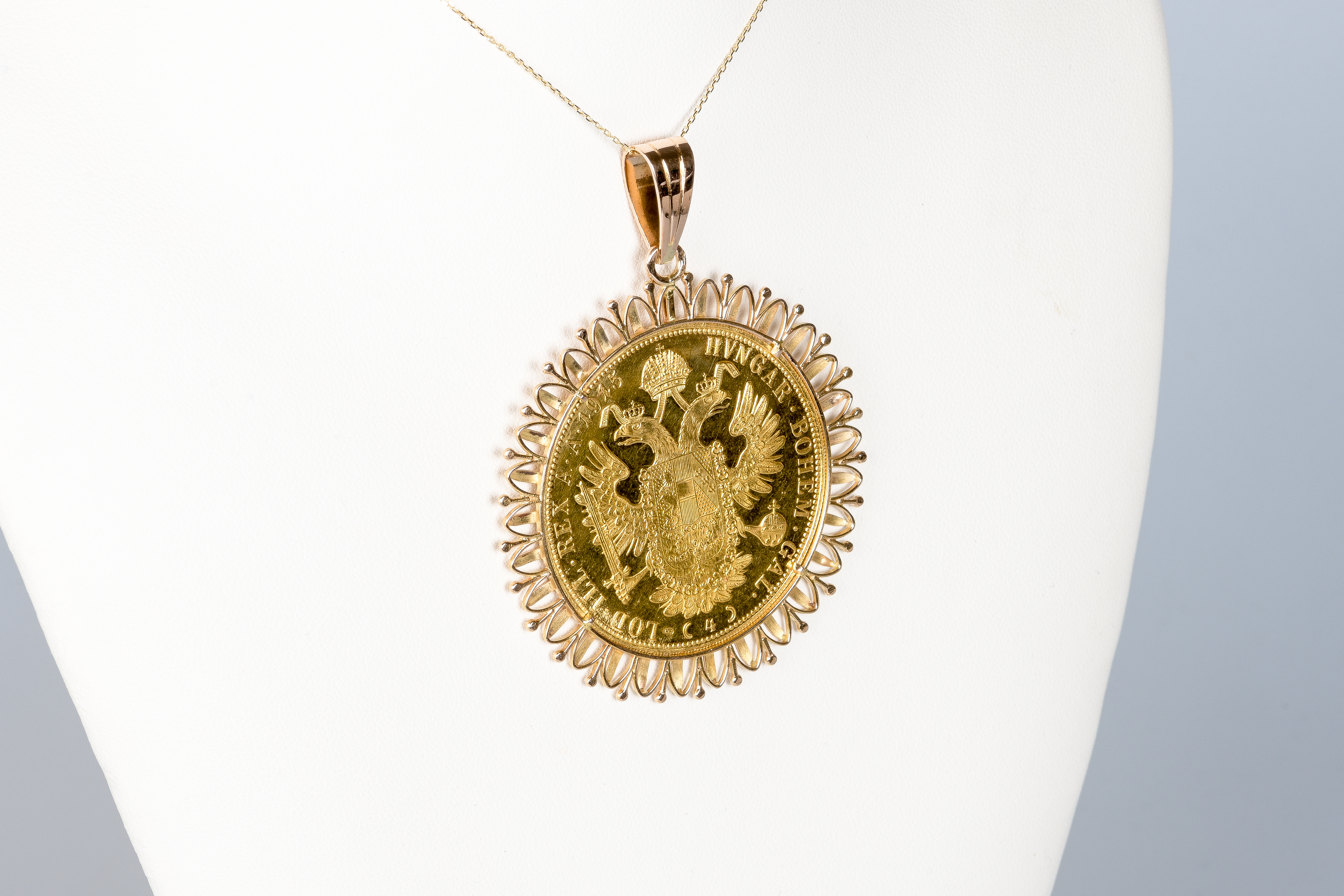 Ce pendentif est serti d'une véritable pièce d'or 23 3/4 carats. Le ducat est une ancienne monnaie d'or circulant à l'origine dans l'Europe du Moyen Âge à partir du XIIᵉ siècle et dont l'usage se