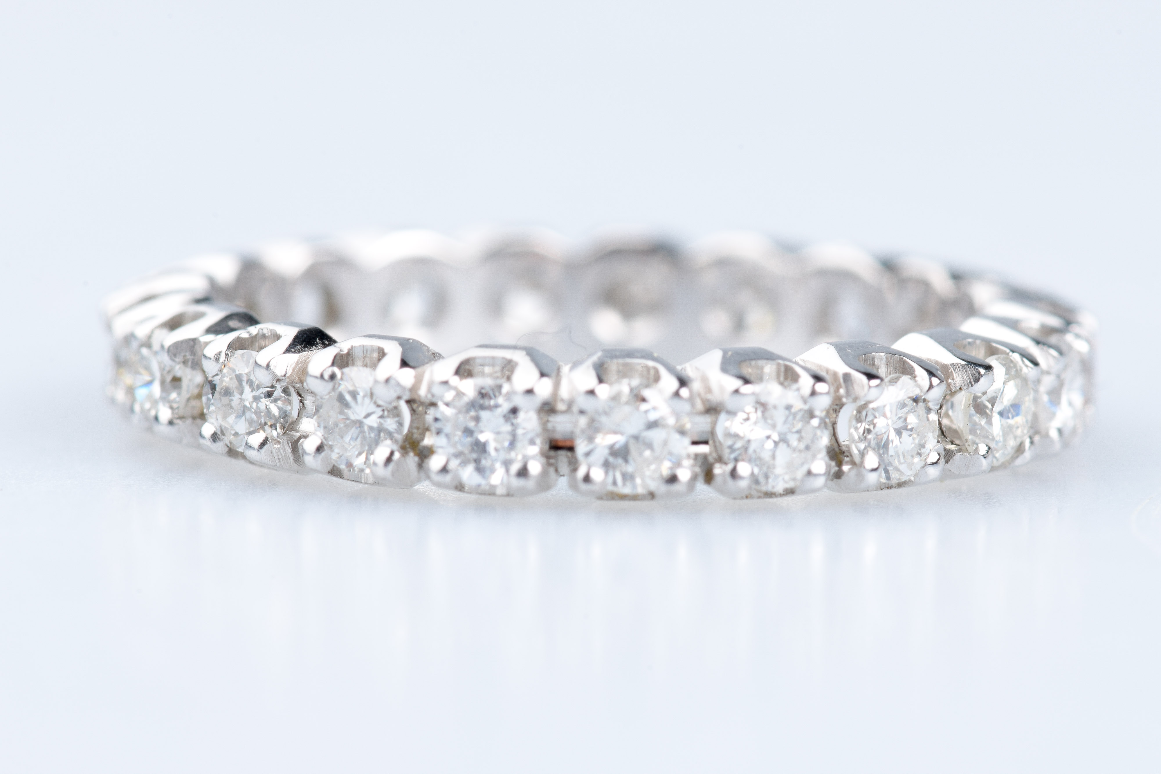 Alliance "éternité" en or blanc 18K (750/1000), entièrement pavée de diamants naturels taille brillant de 0,06 carats chacun soit un total de 1,26 carats . Chaque pierre est soigneusement sertie en