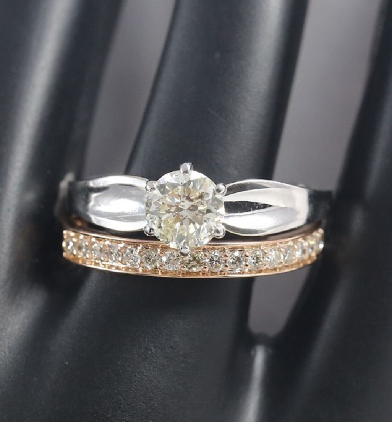 Set di 2 anelli con diamante solitario e diamanti laterali: 18 carati / 750 Oro bianco e oro rosa 18 K / 750 con marchio di garanzia Peso dell’oro - 4,880 g Misura dell’anello - UK L - EU 51 - US 6 Larghezza anello superiore: 6 mm Dettagli diamante Peso totale del diamante - 1,01 ct. Peso del diamante centrale: 0,77 ct. Peso diamante laterale: 0,24 ct. Colore - JK Chiarezza - SI Taglio - Brillante rotondo Numero totale di diamanti - 20 Trattamento - nessuno Condizioni: ottime Certificato di autenticità di HGL