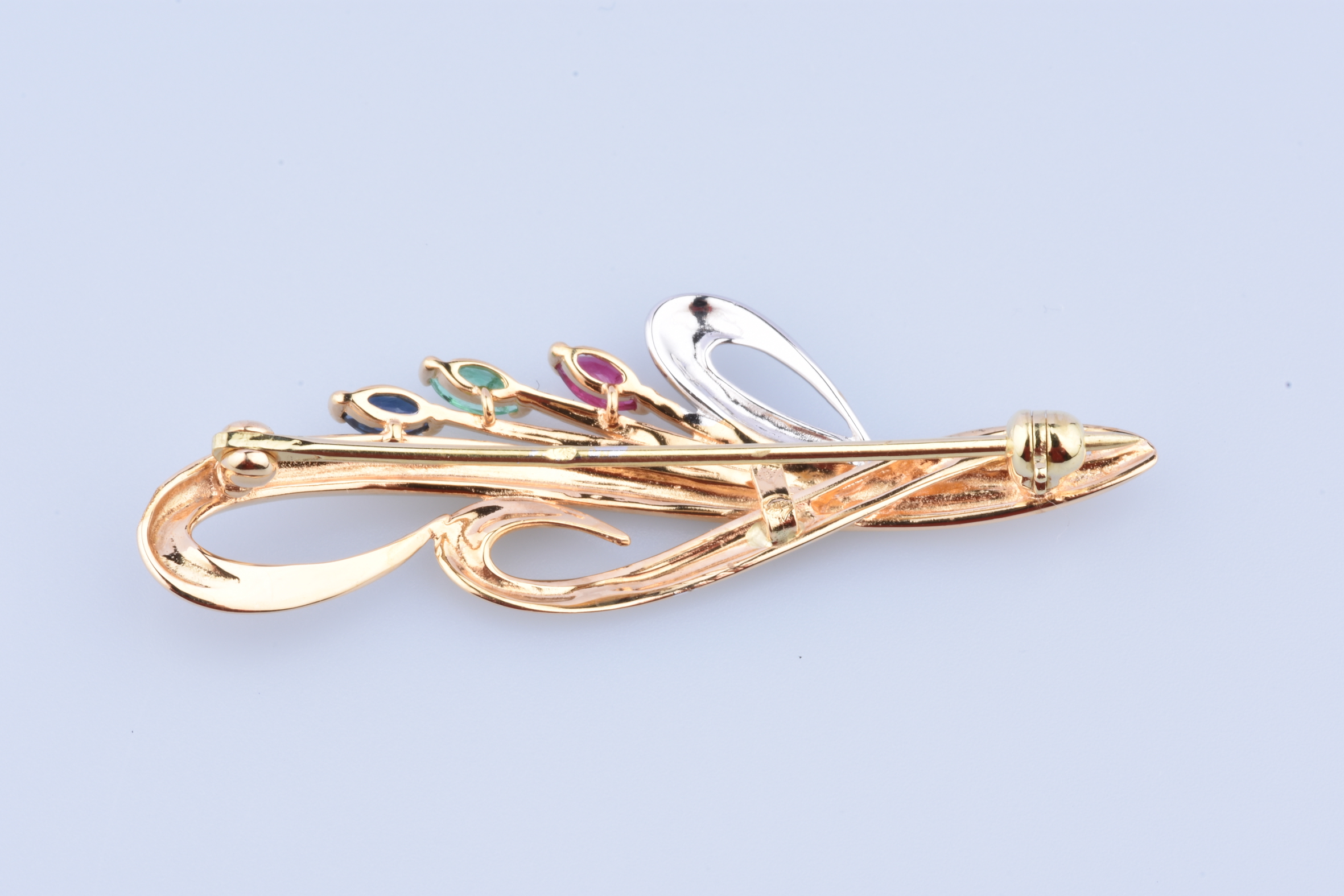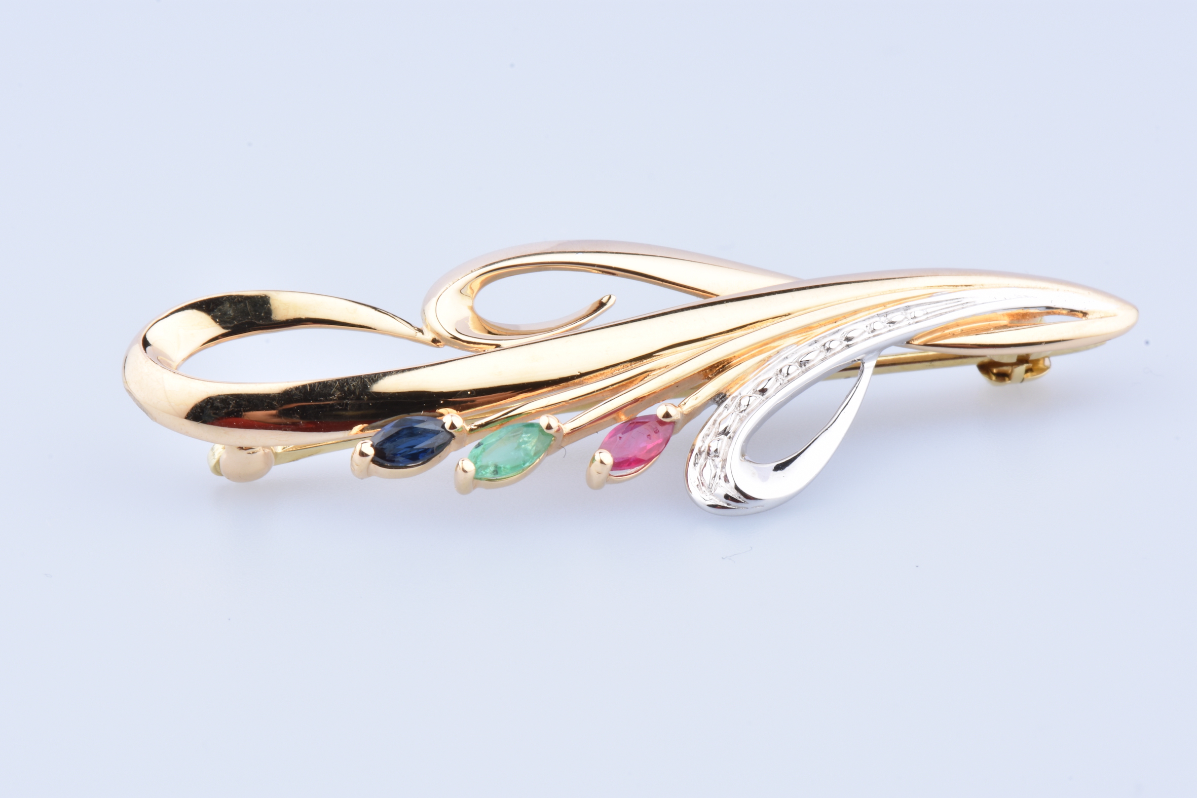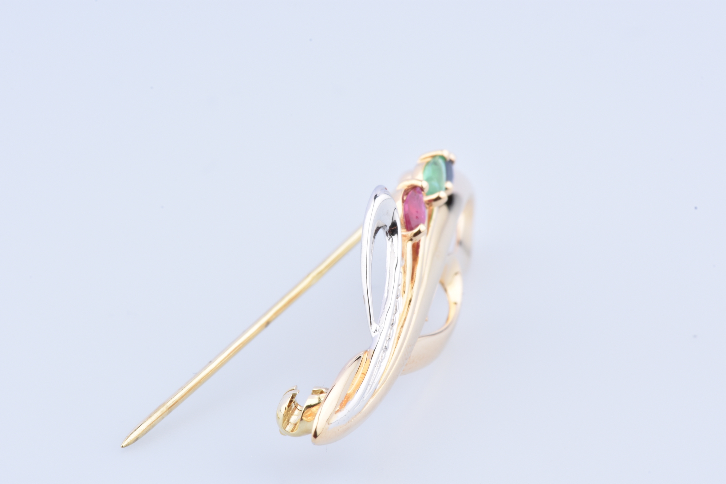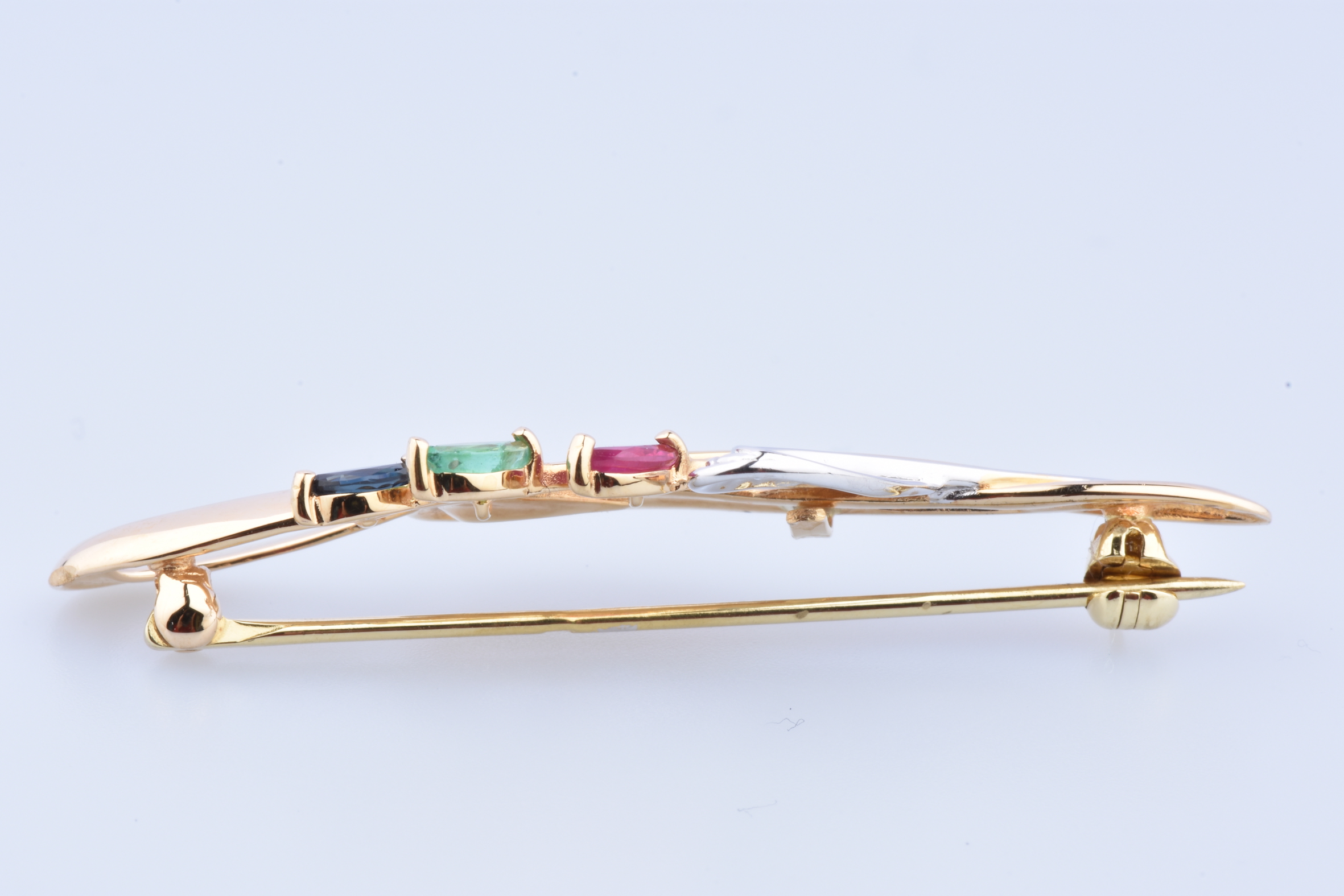 Spilla rotonda in oro 18 carati (750 millesimi), composta da 3 pietre preziose a navetta: 1 rubino 0,05 ct, 1 smeraldo 0,04 ct e 1 zaffiro 0,04 ct. Chiusura per passeggino.