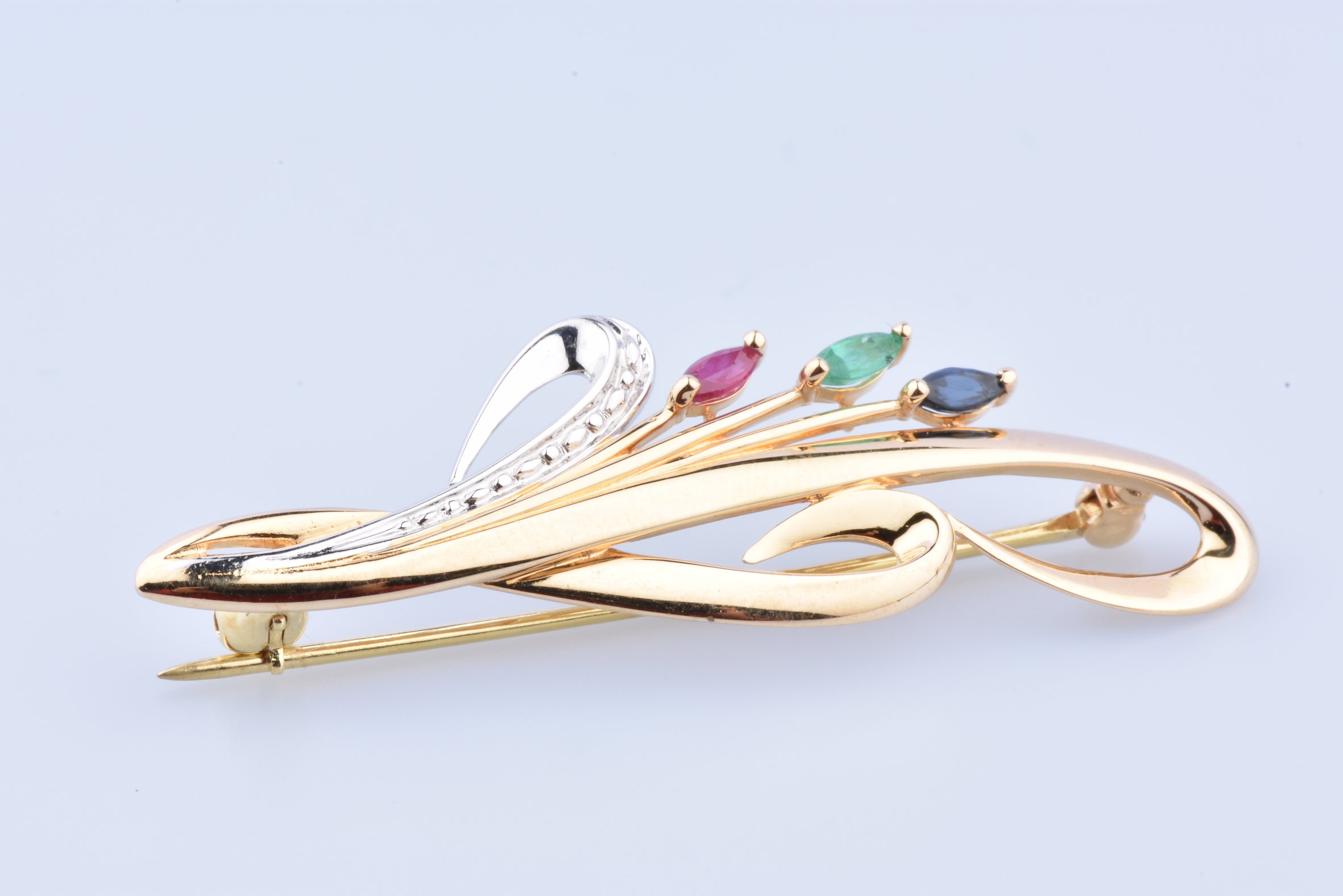 Broche ronde en or 18 carats (750 millièmes), composée de 3 pierres précieuses navette : 1 rubis 0.05ct, 1 émeraude 0.04ct et 1 saphir 0.04ct. Fermoir poussette.